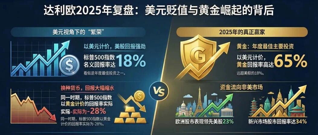 ↑点击上面图片 加雪球核心交流群 ↑ 风险提示:本文所提到的观点仅代表个人的意见,所涉及标的不作推荐,据此买卖,风险自负。 作者:摩根在野 来源:雪球 "2025年的真正故事并非是股市或人工智能,而是货币价值的崩溃以及远离美国资产的转变。" 近期,桥水基金创始人Ray Dalio(瑞·达利欧)发布了最新的"2025年度报告与展望"。 曾经那本很火的畅销书《原则》,就是他写的。老爷子在投资领域非常成功,桥水基金旗下的"全天候策略"产品多年以来业绩优异,在海内外有非 常多的拥趸,每次他的新书和新的观点,总会对投资者有重要的参考意义。 这次Ray Dalio老爷子到底讲了啥?他对2025年的总结是什么?有哪些建议?作为全球多元配置的投资者,应该如何看待他的总结和建议?2026年 的多元资产配置应该如何调整?今天仔细研究了报告,下面我就来逐一解读。 一、瑞·达利欧的2025年总结 首先,老爷子并未被表面繁荣的美国股市所迷惑,而是发出了关于"金钱价值"和"资产泡沫"的深刻警告,他主要观点如下: 他指出,最关键的不是股票涨了多少,而是钱变得不值钱。如果以黄金(他视为唯一的非信用货币)计价,美元在2025年实际上大幅贬值。 ...