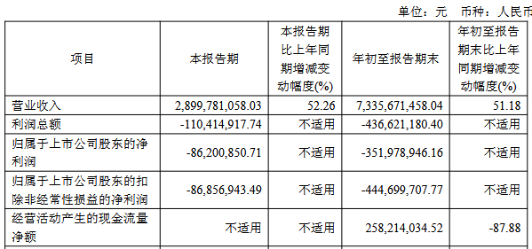 | | | | | 早位: 元 中秤:人民门 | | --- | --- | --- | --- | --- | | | | 本报告期 | | 年初至报告 | | 项目 | 本报告期 | 比上年同 | 年初至报告期末 | 期末比上年 | | | | 期增减少 | | 同期增减变 | | | | 动幅度(%) | | 动幅度(%) | | 营业收入 | 2.899.781.058.03 | 52.26 | 7.335.671.458.04 | 51.18 | | 利润总额 | -110.414.917.74 | 不适用 | -436.621.180.40 | 不适用 | | 归属于上市公司股东的净 | -86.200.850.71 | 不适用 | -351.978.946.16 | 不适用 | | 利润 | | | | | | 归属于上市公司股东的扣 | -86.856.943.49 | 不活用 | -444.699.707.77 | 不适用 | | 除非经常性损益的净利润 | | | | | | 经营活动产生的现金流量 | 不透用 | 不透用 | 258.214.034.52 | -87.88 | | 净额 ...