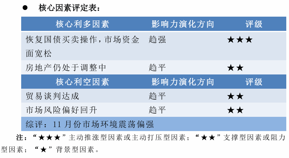 薛鹤翔、唐广华(薛鹤翔系申银万国期货研究所所长、中国首席经济学家论坛成员) | 核心利多因素 | 影响力演化方向 | 评级 | | --- | --- | --- | | 恢复国债买卖操作,市场资金 趋强 | | ★★★ | | 面宽松 | | | | 房地产仍处于调整中 趋平 | | ★★ | | 核心利空因素 | 影响力演化方向 | 评级 | | 贸易谈判达成 趋平 | | ★★ | | 市场风险偏好回升 趋平 | | ★★ | | 综评:11月份市场环境震荡偏强 | | | | t:"★★"主动推涨型因素或丰动打压型因素:"★★"支撑型因素或阴力 | | | + 报告正文 一、行情分析 + 摘要 10月份以来,国债期货价格走势偏强,一改三季度的弱势走势,主要是央行加大公开市场操作力度,恢复国债买卖操作,市场资金面转 松,加上海外美国政府停摆,美联储降息和中美贸易摩擦等因素影响。 展望后市,尽管中美经贸磋商达成共识,但外部环境复杂严峻,不确定性仍存在,美联储进入降息周期后,美债收益率总体回落,国内 货币政策空间加大。国内工业生产保持高位,以房地产为代表的需求端仍疲软,物价处于低位,二十届四中全会提出了"十 ...
