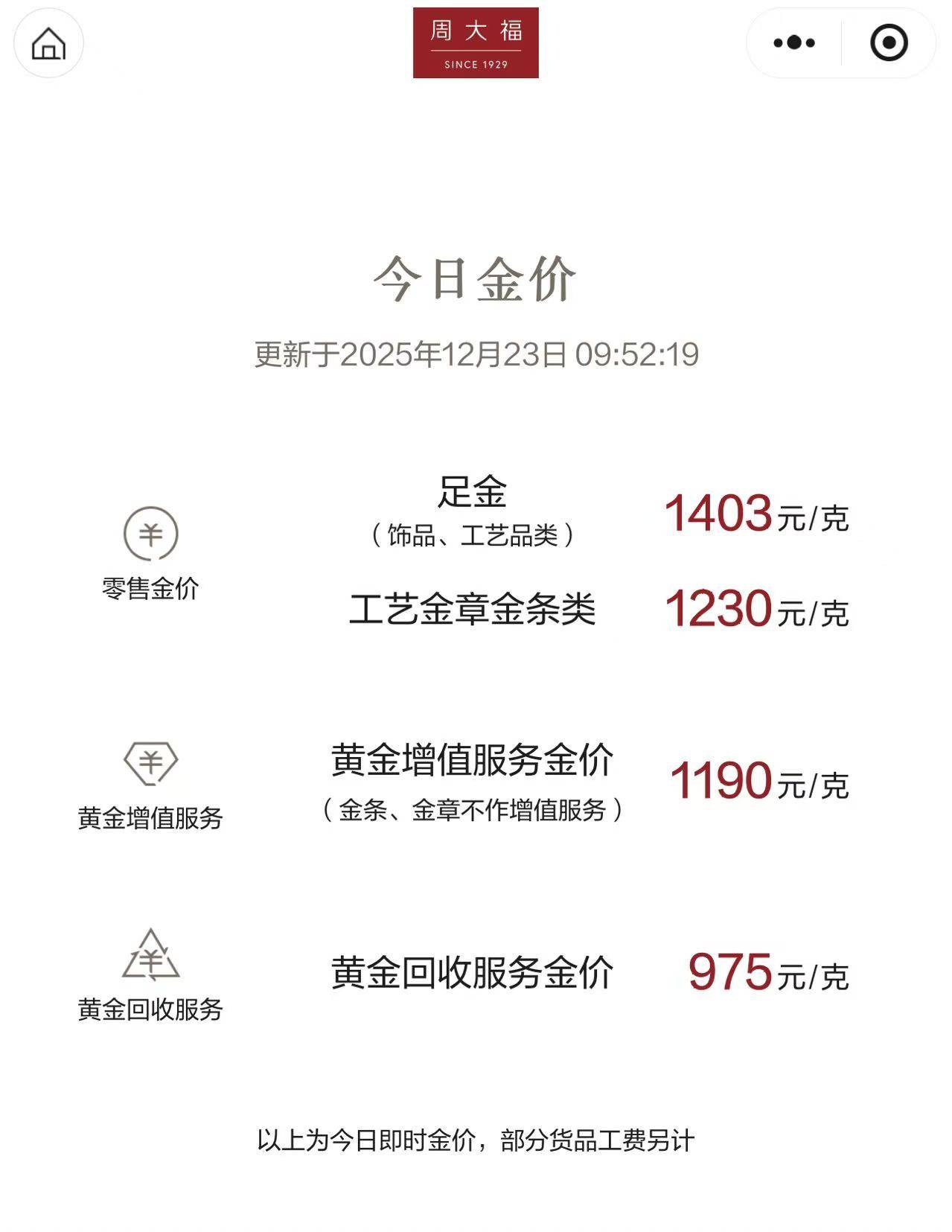 12月23日,随着国际国内金价创下历史新高,多家黄金珠宝品牌公布的首饰金报价也水涨船高,突破1400元/克关口。其中,周大福、周生生首饰金报价均 达到1403元/克,老庙黄金报价达到1402元/克,六福珠宝、金至尊报价达到1401元/克。 | 居美 ( 饰品、工艺品类 ) | 1403元/ | | --- | --- | | 工艺金章金条类 | 1230元/ | 图片来源:周大福官方微信公众号 品牌铂金价格也同步走高。12月23日,950铂金饰品价格达到861元/克。 中国证券报·中证金牛座记者当日走访北京地区多家品牌金店发现,多数门店内并无顾客,仅有销售人员。部分品牌推出圣诞、新年主题活动,但优惠力度 有限;也有门店打出 "进店就有好礼相送" 的广告,试图吸引客流。有导购对记者表示,受金价持续飙升影响,近几日门店的购金者很少。 本报记者 董添/摄 对于金价飙升的原因,业内普遍认为,市场对美联储2026年降息的预期持续升温,全球实物黄金ETF持续净流入,均为金价上行提供支撑。 广发证券研报显示,美国实际利率和美元指数预期持续走弱,推动金价上涨。随着金价快速上行且高位运行,2026年黄金企业业绩有望全面释放。 ...