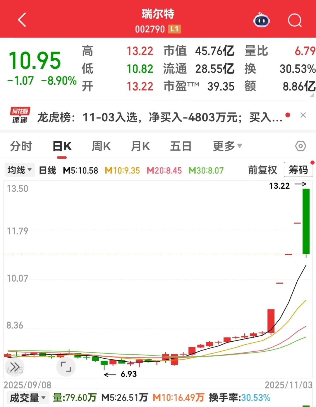 超导研究已推动了低温物理、量子力学、材料科学的交叉融合。未来,随着高温超导机制的明晰与制备工艺的优化,这项"低温奇迹"或将成为连接基础科 学与产业变革的重要纽带。 瑞尔特一度上演"天地板" 11月3日,瑞尔特(002790)开盘涨停,开盘后短短6分钟内,股价直线跳水,盘中触及跌停板,上演了"天地板"走势。截至收盘,该股下跌8.9%。此前4 个交易日,该股连续收获涨停板。 瑞尔特是厦门市本土企业,公司致力成为全球领先的卫浴空间和家庭水系统解决方案提供商,主营产品占比最高的为智能坐便器。今年前三季度,公司营 业总收入为13.63亿元,同比下滑20.26%;实现净利润0.62亿元,同比下滑51.26%。报告期内,由于家居卫浴行业市场仍面临较为激烈的竞争状态,需求 端整体偏弱,产品单价略有下滑。 | | 瑞尔特 | | | | | | --- | --- | --- | --- | --- | --- | | | 002790 L1 | | | | | | 高 10.95 | 量比 | | 13.22 市值 45.76亿 | | 6.79 | | 低 | 换 | | 10.82 流通 28.55亿 | | 30.53 ...