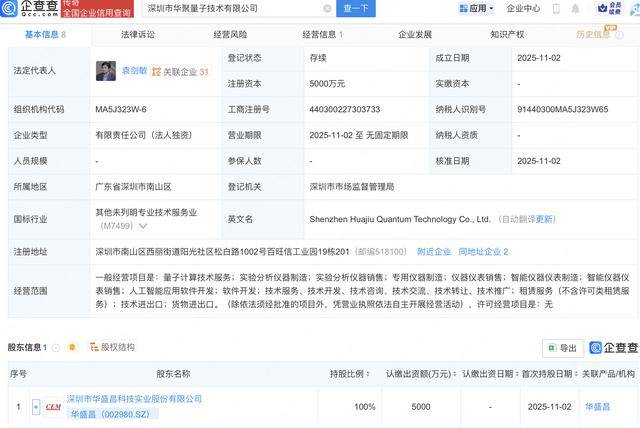 | 医者 股东名称 | 持股比例: | 认缴出资额(万元)= 认缴出资日期;首次持股日期;关联产品/机构 The first of the first to the many of the state of the state of the states of | | --- | --- | --- | | 1 | 100% | 5000 2025-11-02 华盛昌 | 企查查APP显示,近日,深圳市华聚量子技术有限公司成立,注册资本5000万元,经营范围包含:量子 计算技术服务;智能仪器仪表销售;人工智能应用软件开发;软件开发等。企查查股权穿透显示,该公 司由华盛昌(002980)全资持股。 | ◎ 北章章 全国企业体用意调 | 深圳市华景量子技术有限公司 ○ 蓝一下 ■应用 · 企业中心 [] 食 山原 (7 | | | | | --- | --- | --- | --- | --- | | 基本信息 8 | 历史馆 2 法律诉讼 经营信息 1 企业发展 | 经营风险 | | 知识产权 | | 法定代表人 | 存续 9 袁剑郎 怒关联企业 35 | 登记状态 | 成立日期 | 2025-11-02 | ...