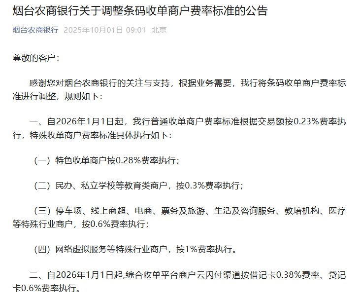 (来源:POS圈支付网) 2025年以来,一场覆盖全国多个省份的收单业务费率调整在农商行体系内持续推进。从陕西农信扶风联 社宣布 "每月6万元免费额度 + 超额0.25%费率",到紫金农商银行推行 "月度动态优惠名单管理",再到 平阴农商行按存款贡献度设置五级费率阶梯,曾经普惠市场的 "0 费率" 模式正加速退场。 据不完全统计,目前安徽、陕西、山西、江苏、山东、浙江、青海等省份的农商行已密集发布调整公 告,调整范围均聚焦收单业务手续费,核心变化体现在三方面: 一是全面取消无条件 "0费率",结束银行长期垫付手续费的模式; 二是建立与商户贡献度挂钩的差异化定价体系; 三是增设违规惩罚性费率条款,强化风险管控。 这场行业性调整并非突发之举,某中部地区农商行人士透露,费率优化自去年已逐步展开,2025年的集 中落地标志着调整进入攻坚阶段。 山东烟台农商行公告称,自2026年1月1日起,普通收单商户费率标准根据交易额按0.23%费率执行,特 色收单商户按0.28%费率执行;民办、私立学校等教育类商户,按0.3%费率执行;停车场、线上商超、 电商、票务及旅游、生活及咨询服务、教培机构、医疗等特殊行业商户,按0.6%费 ...