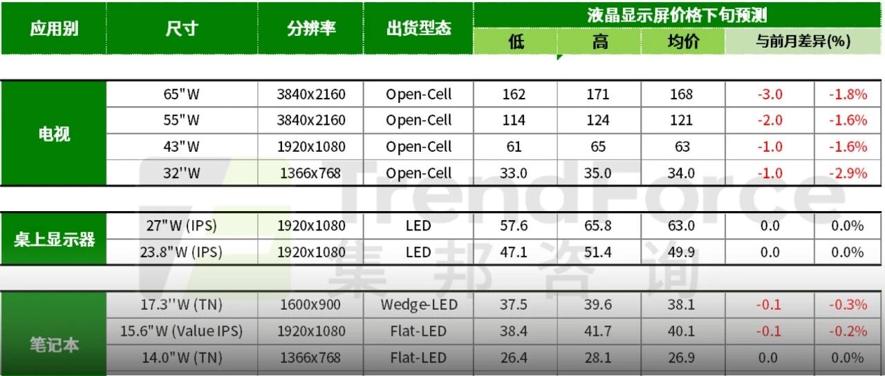 | 应用别 | ਮਿਕ | 分辨率 | 出货型态 | | | 液晶显示屏价格下旬预测 | | | | --- | --- | --- | --- | --- | --- | --- | --- | --- | | | | | | 作 | 글 | 均价 | 与前月差异(%) | | | 电视 | es" w | 3840x2160 | Open-Cell | 162 | 171 | 168 | -3.0 | -1.8% | | | 55" W | 3840x2160 | Open-Cell | 114 | 124 | 121 | -2.0 | -1.6% | | | 43" W | 1920x1080 | Open-Cell | el | ୧૨ | 63 | -1.0 | -1.6% | | | 32"W | 1366x768 | Open-Cell | 33.0 | 35.0 | 34.0 | -1.0 | -2.9% | | 桌上显示器 | 27"W (IPS) | 1920x1080 | LED | 57.6 | 65.8 | 63.0 | 0.0 | 0.0% | | | 23.8"W (IPS) | ...
