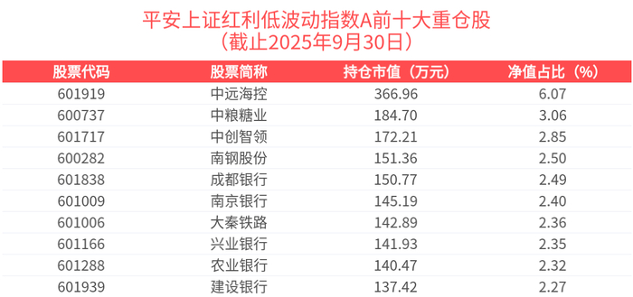截至2025年11月4日,平安上证红利低波动指数A(020456)近1年最大回撤6.70%,相对基准回撤0.98%, 在可比基金中回撤最小。 截至2025年11月4日,平安上证红利低波动指数A(020456)开放定投以来定投收益率为9.76%。 平安上证红利低波动指数A(020456)管理费率为0.50%,托管费率为0.10%,费率0.60%。 截至2025年11月5日 10:18,上红低波指数(H50040)下跌0.11%。 资金流向方面,截至2025年11月4日,上红低波指数近4天主力资金连续净流入,最高单日净流入54.40 亿元净流入,合计吸金120.57亿元,日均净流入30.14亿元。 融资方面,截至2025年11月4日,上红低波指数近1周融资净买入5.48亿元,最新融资余额达996.49亿 元。 与此同时,截至2025年11月4日,平安上证红利低波动指数A交易拥挤度(以指数与沪深300指数月日均 换手率构建)处于成立以来25.0%的分位,低于历史上75.00%的时间。 截至2025年11月4日,平安上证红利低波动指数A单位净值为1.13元,较前一交易日上涨0.84%,创近1 月新高。 截至2025年 ...