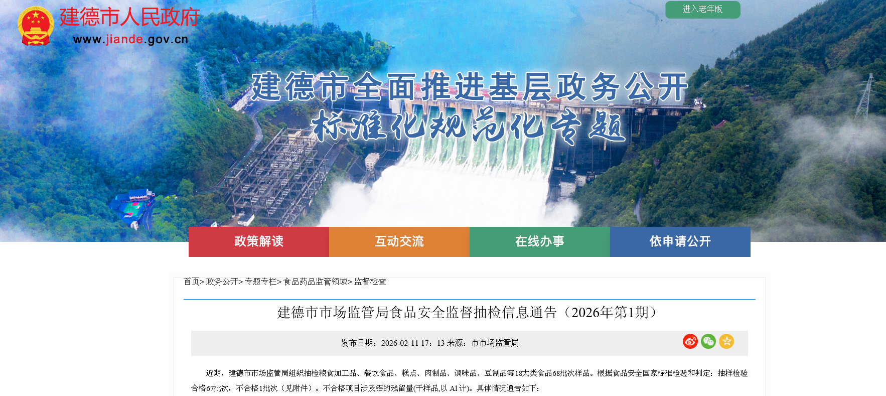 浙江省 建德市市场监管局食品安全监督抽检信息通告(2026年第1期)