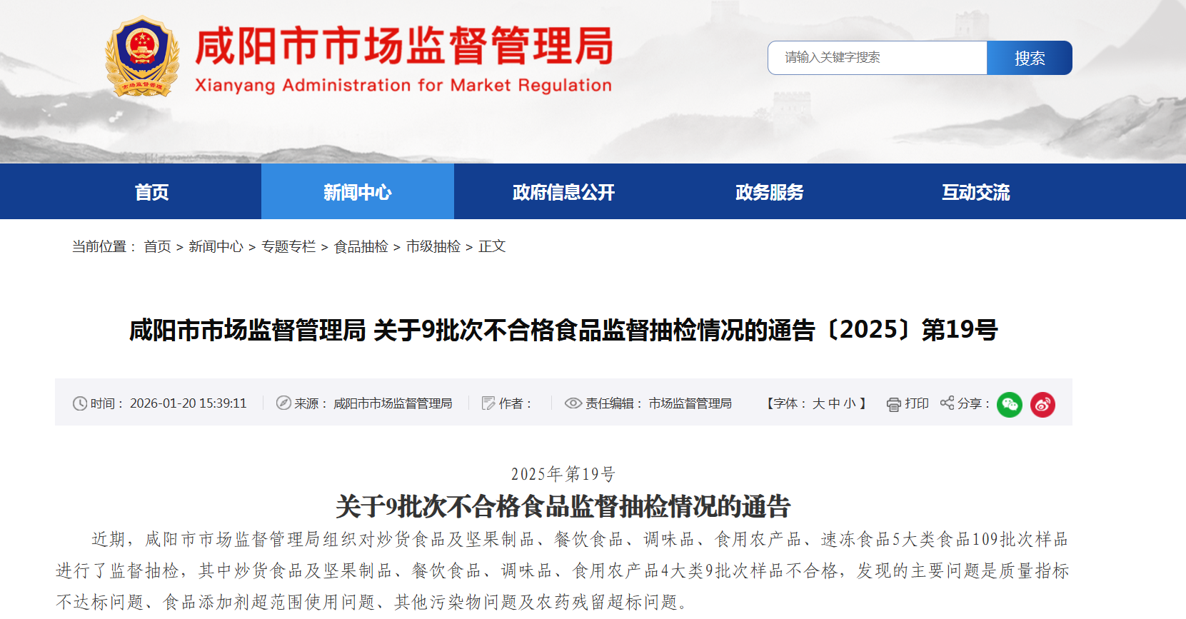 陕西省咸阳市市场监督管理局关于9批次不合格食品监督抽检情况的通告〔2025〕第19号