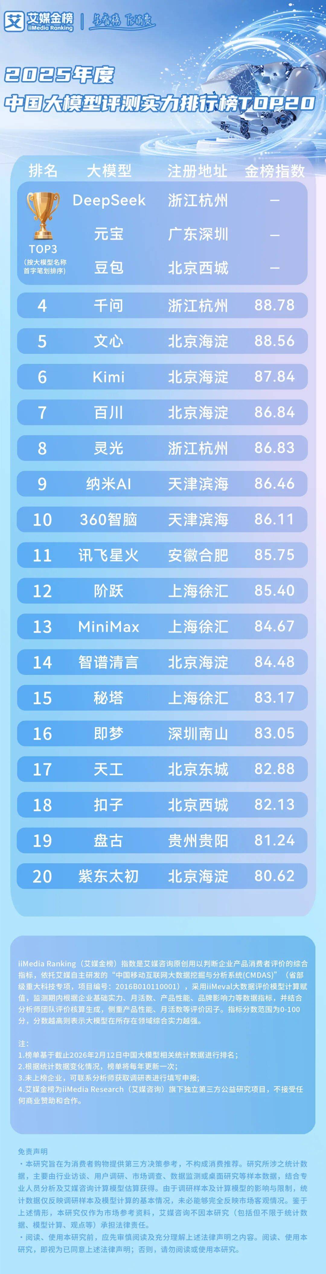 2025年度中国大模型评测实力排行榜TOP20重磅揭晓:DeepSeek、元宝、豆包领跑