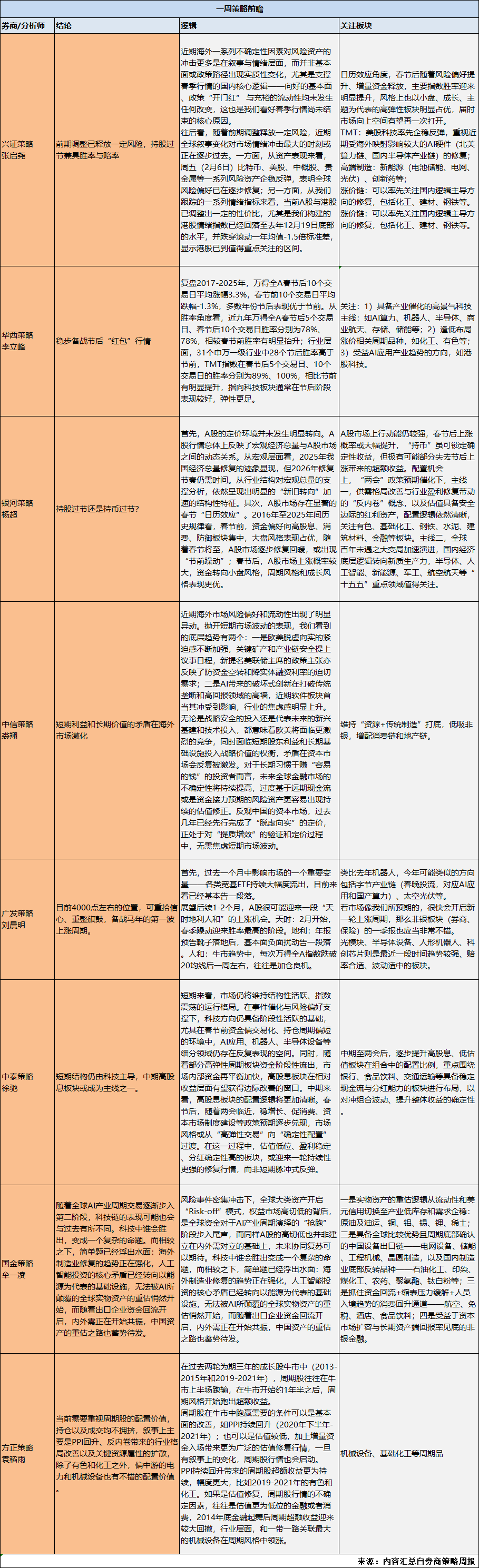 核心观点 - 多家券商策略分析师对“持股过节还是持币过节”的讨论整体偏向乐观,认为前期调整已释放风险,春季行情核心逻辑未变,持股过节兼具胜率与赔率,并建议备战节后行情 [1][2][3][4] 市场整体判断与行情展望 - 兴证策略认为,支撑春季行情的国内核心逻辑——向好的基本面、政策“开门红”与充裕的流动性均未发生任何改变,春季行情尚未结束 [2] - 广发策略指出,目前万得全A指数4000点左右的位置占据天时地利人和,可重拾信心备战新一轮上涨周期 [4] - 中信策略认为,中国资本市场已完成“脱虚向实”的定价,正处于对“提质增效”的验证和定价过程中,无需焦虑短期市场波动 [6] - 国金策略指出,全球资金对于AI产业周期演绎的“抢跑”阶段步入尾声,人工智能投资的核心矛盾已转向以能源为代表的基础设施,全球实物资产的重估悄然开始 [7] 历史规律与“日历效应” - 华西策略复盘2017-2025年数据显示,万得全A春节后10个交易日平均涨幅3.3%,春节前10个交易日平均跌幅-1.3%,多数年份节后表现优于节前 [3] - 近九年万得全A春节后5个交易日、春节后10个交易日胜率分别为78%、78%,相较春节前胜率有明显抬升 [3] - 银河策略分析2016年至2025年历史规律显示,春节前资金偏好高股息、消费、防御板块,大盘风格占优;春节后A股上涨概率较大,资金转向小盘、周期和成长风格 [3] - 广发策略指出,2月开始春季躁动迎来胜率最高的阶段,且牛市趋势中,每次万得全A指数跌破20日均线后一周左右往往是加仓良机 [4][6] 板块与行业配置建议 - **科技成长(TMT/高端制造)**:兴证策略建议关注受海外映射影响较大的AI硬件(北美算力链、国内半导体产业链)以及高端制造如新能源(电池储能、电网、光伏)、创新药等 [5];华西策略指出TMT指数在春节后5个交易日、10个交易日的胜率分别为89%、100%,指向科技板块节后表现较好,弹性更足,建议关注AI算力、机器人、半导体、商业航天、存储、储能等高景气科技主线 [3][5];银河策略建议关注半导体、人工智能、新能源、军工、航空航天等“十五五”重点领域 [6];广发策略指出光模块、半导体设备、人形机器人、科创芯片是近期趋势较强、赔率合适的板块 [6] - **周期与“涨价链”**:兴证策略建议关注国内逻辑主导的涨价链修复,包括化工、建材、钢铁等 [5];华西策略建议逢低布局涨价相关周期品种,如化工、有色等 [5];银河策略建议关注供需格局改善与行业盈利修复带动的“反内卷”概念,如有色、基础化工、钢铁、水泥、建筑材料等 [6];方正策略强调当前需重视周期股的配置价值,叙事主要是PPI回升、反内卷带来的行业格局改善以及关键资源属性扩散,除了有色和化工,偏中游的电力设备和机械设备也有配置价值 [7] - **高股息与稳定收益板块**:银河策略认为估值具备安全边际的红利资产配置逻辑清晰,关注金融等板块 [6];中泰策略建议中期至两会后,逐步提升高股息、低估值板块配置比例,重点围绕银行、食品饮料、交通运输等具备稳定现金流与分红能力的板块布局 [6] - **消费与地产链**:中信策略建议增配消费链和地产链 [6];国金策略建议关注抓住资金回流趋势的消费回升通道,如航空、免税、酒店、食品饮料 [7] - **非银金融**:广发策略指出,若市场开启新一轮上涨周期,非银板块(券商、保险)的一季报应当非常不错 [6];国金策略提到受益于资本市场扩容与长期资产端回报率见底的非银金融 [7] - **全球实物资产与出口链**:国金策略建议关注实物资产重估逻辑,如原油及油运、铜、铝、锡、稀土;以及具备全球比较优势且周期底部确认的中国设备出口链,如电网设备、储能、工程机械、晶圆制造 [7] 市场情绪与风险偏好 - 兴证策略指出,近期海外不确定性因素对风险资产的冲击更多在叙事与情绪层面,而非基本面或政策路径实质性变化 [2] - 从资产表现看,2月6日比特币、美股、中概股、贵金属等一系列风险资产企稳反弹,表明全球风险偏好已在逐步修复 [2] - 兴证策略构建的港股情绪指数已回落至去年12月19日底部水平,并跌穿滚动一年均值-1.5倍标准差,显示港股已到值得重点关注区间 [2] - 华西策略从日历效应角度指出,春节后随着风险偏好提升、增量资金释放,主要指数胜率迎来明显提升 [5]