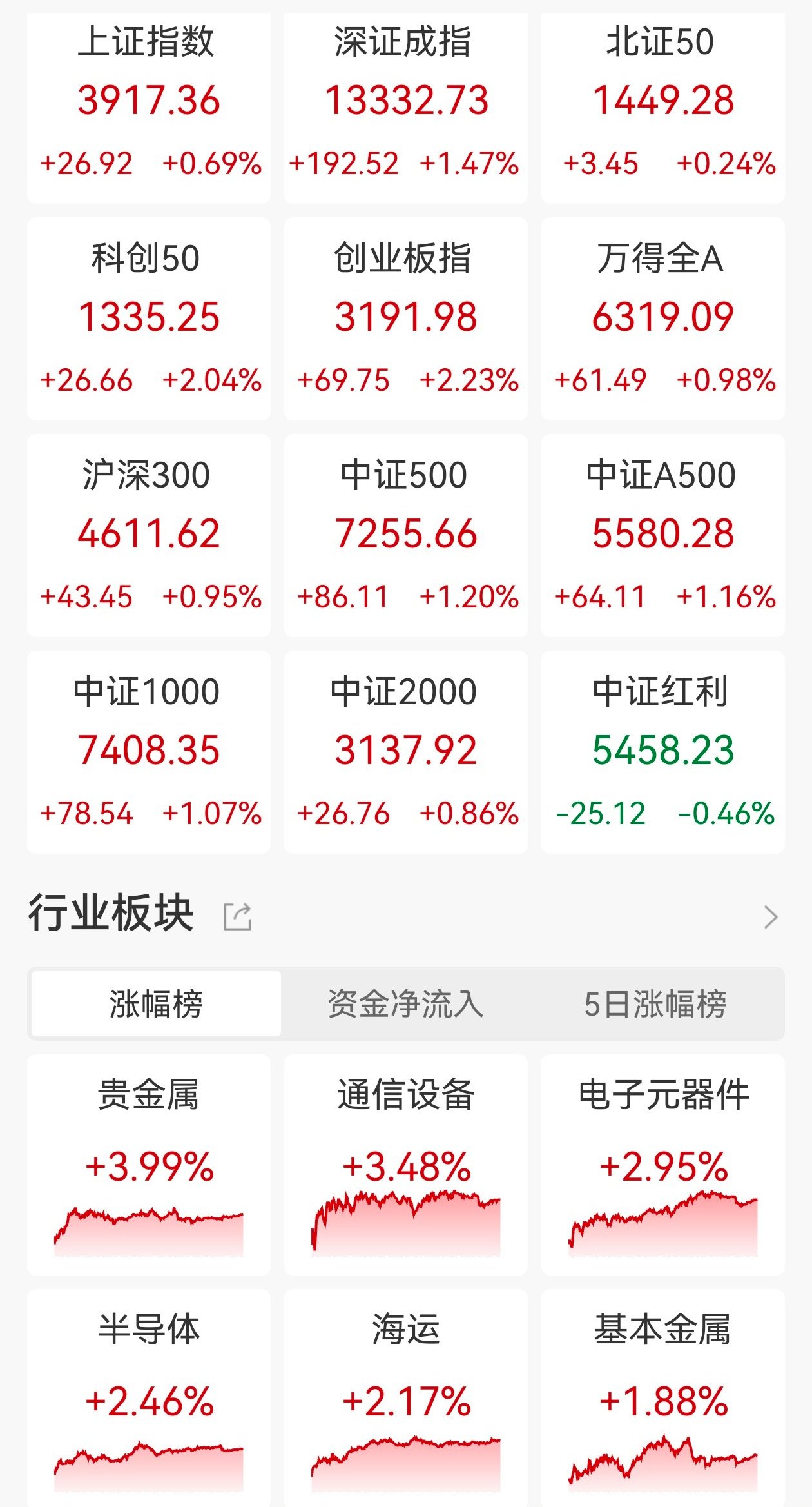 | 内地股票 区 | | | | --- | --- | --- | | 行情 | 资金净流入 | 涨跌分布 | | 上证指数 | 深证成指 | 北证50 | | 3915.20 | 13318.80 | 1454.89 | | +24.75 +0.64% +178.59 +1.36% +9.05 +0.63% | | | | 科创50 | 创业板指 | 万得全A | | 1334.12 | 3178.51 | 6320.88 | | +25.53 +1.95% +56.27 +1.80% +63.28 +1.01% | | | | 沪深300 | 中证500 | 中证A500 | | 4604.43 | 7265.85 | 5574.74 | | +36.25 +0.79% +96.30 +1.34% +58.57 +1.06% | | | | 中证1000 | 深证100 | 中证红利 | | 7425.89 | 5814.77 | 5465.41 | | +96.09 +1.31% +68.41 +1.19% -17.94 -0.33% | | | 记者丨江佩佩 见习记者张嘉钰 编辑丨谢珍 12月22日 ...