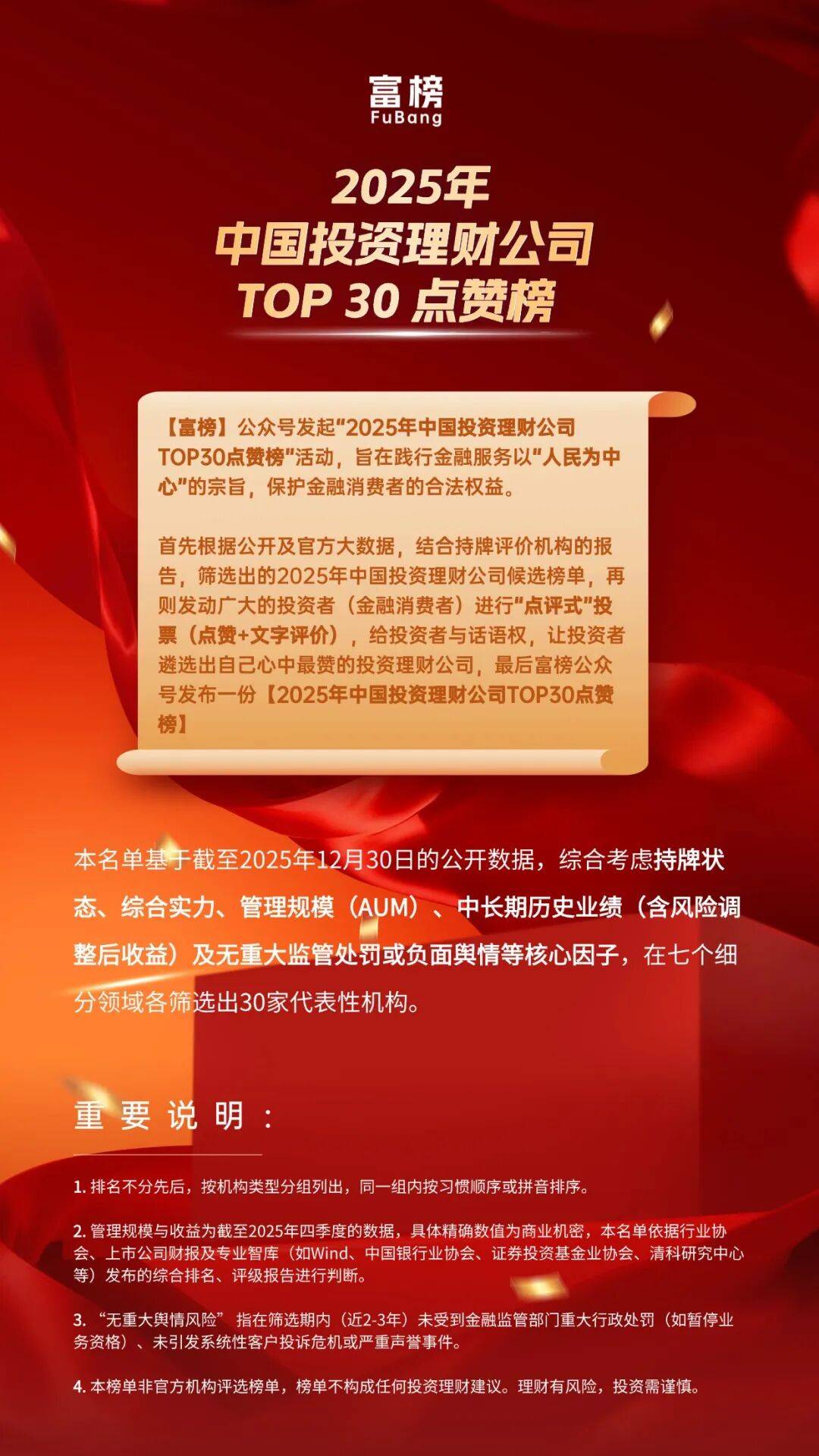 2025GE 中国语会主要 TOP 30 点赞榜 【富榜】公众号发起"2025年中国投资理财公司 TOP30点赞榜"活动,旨在践行金融服务以"人民为中 心"的宗旨,保护金融消费者的合法权益。 首先根据公开及官方大数据,结合持牌评价机构的报 告,筛选出的2025年中国投资理财公司候选榜单,再 则发动广大的投资者(金融消费者)进行"点评式"投 票(点赞+文字评价),给投资者与话语权,让投资者 遴选出自己心中最赞的投资理财公司,最后富榜公众 号发布一份【2025年中国投资理财公司TOP230点靠 t 本名单基于截至2025年12月30日的公开数据,综合考虑持牌状 态、综合实力、管理规模(AUM)、中长期历史业绩(含风险调 整后收益)及无重大监管处罚或负面舆情等核心因子,在七个细 分领域各筛选出30家代表性机构。 要说明: ED 炉机构类型分组制中,同一组内齿习惯师应成进产状应 私募基金管理机构- 股权/创业投资类(TOP 30) 综评:聚焦于募资能力、历史DPI(现金回报率)、明星项目退出及行业影响力。 注:投票后可见结果,每人限投10票,截止2026年1月30日。最终根据得票数公布"2025年中国投资理财TOP ...