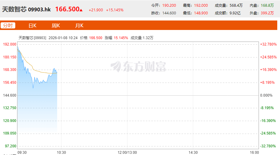 红星资本局1月8日消息,今日,天数智芯(9903.HK)正式在港交所上市,成为"港股国产GPU第二股"。 天数智芯开盘股价报190.2港元,较发行价144.60港元涨31.54%,总市值达483.7亿港元;随后股价涨幅收窄,截至发稿时涨15%, 报166.5港元。 由于高研发投入及规模效应有限等,天数智芯与同行业企业一样,仍处于亏损状态。在2022至2024年间,分别录得净亏损5.54亿 元、8.17亿元、8.92亿元。截至今年上半年,天数智芯录得亏损6.09亿元。 红星新闻记者 俞瑶 符小茵 | | 天数智芯 09903.hk 166.500 +21.900 +15.145% | | | 今开:190.200 | 最高: 192.000 | 成交量:568.4万 | 内盘:168.8万 | | --- | --- | --- | --- | --- | --- | --- | --- | | | | | 最低: 148.900 成交额:9.92亿 | 昨收:144.600 | | | 外盘: 399.2万 | | स्त्रीय | 日K 聞K 月K | | | | | | | | 192.000 | 天数 ...