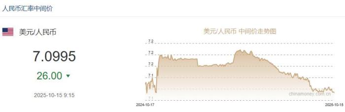 10月15日人民币对美元中间价报7.0995元 上调26个基点