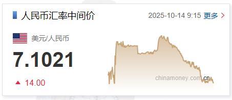 10月14日人民币对美元中间价报7.1021元 下调14个基点
