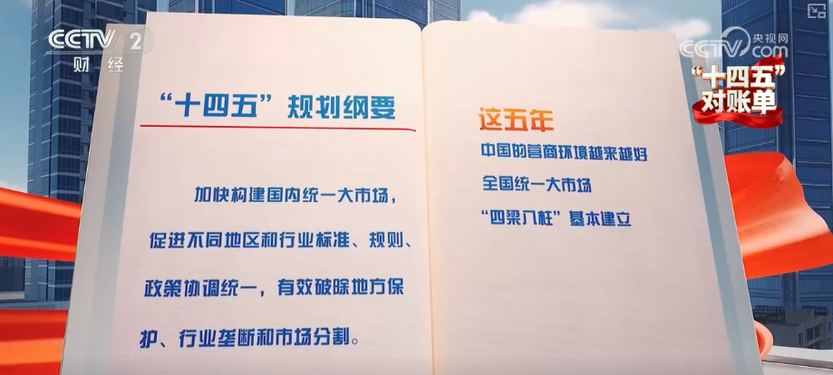 央视网消息:市场是最稀缺的资源,拥有超大规模且极具增长潜力的市场是我国发展的巨大优势。"十四五"期间,我国纵深推进全国统一大市 场建设,破除要素流通壁垒。 "十四五"规划纲要提出,加快构建国内统一大市场,促进不同地区和行业标准、规则、政策协调统一,有效破除地方保护、行业垄断和市场分 割。这五年,中国的营商环境越来越好,全国统一大市场"四梁八柱"基本建立。 目前,我国已迭代发布5版市场准入负面清单,清单事项从151项减到了106项,集中清理超4200件妨碍全国统一市场和公平竞争的规定和做 法。 "十四五"规划纲要提出,破除制约要素合理流动的堵点,矫正资源要素失衡错配,从源头上畅通国民经济循环。这五年,我国城乡要素流动更 加顺畅,城区常住人口300万以下城市的落户限制基本取消。劳动力、资本、数据等要素跨区域流动更加高效。2024年,全国数据市场交易规 模超1600亿元,同比增长30%以上。初步建成全国统一电力市场体系,市场化交易电量占全社会用电量比重已达63%。 以宽准入打开活力之门,"硬联通""软联通"协同并进。《民营经济促进法》颁布实施,民营企业数量比"十三五"末增长超40%。全社会物流成 本不断降低,202 ...