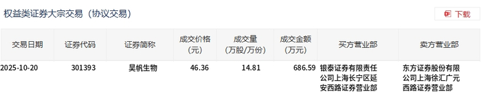 交易概况 - 2025年10月20日,昊帆生物发生一笔大宗交易,成交14.81万股,成交金额为686.59万元[1][2] - 该笔交易成交价格为46.36元,较当日市场收盘价51.12元折价9.31%[1] - 此次大宗交易成交额占公司当日总成交额的16.32%[1] 交易细节 - 买方营业部为银泰证券有限责任公司上海长宁区延安西路证券营业部[2] - 卖方营业部为东方证券股份有限公司上海徐汇广元西路证券营业部[2] - 证券简称为昊帆生物,证券代码为301393[2]