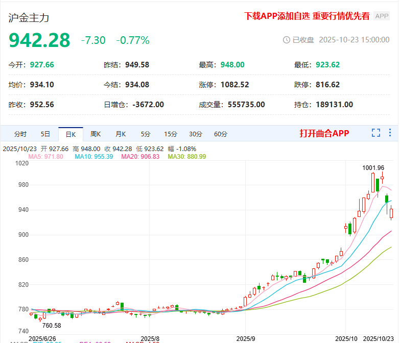 另外,美国参议院未能通过共和党提出的临时拨款法案,政府"停摆"僵局仍在持续。据悉,这是近期在美国政 府"停摆"之后,参议院第12次投票否决了该临时拨款法案。 日内收盘,沪金下跌0.77%,报收942.28元/克。 昨日,美国财政部最新公布的数据显示,截至10月21日,美国联邦政府债务规模总额首次超过了38万亿美元。 这距离8月中旬美国联邦政府债务总额达到37万亿美元仅过去两个多月。 图片来源:曲合APP ...