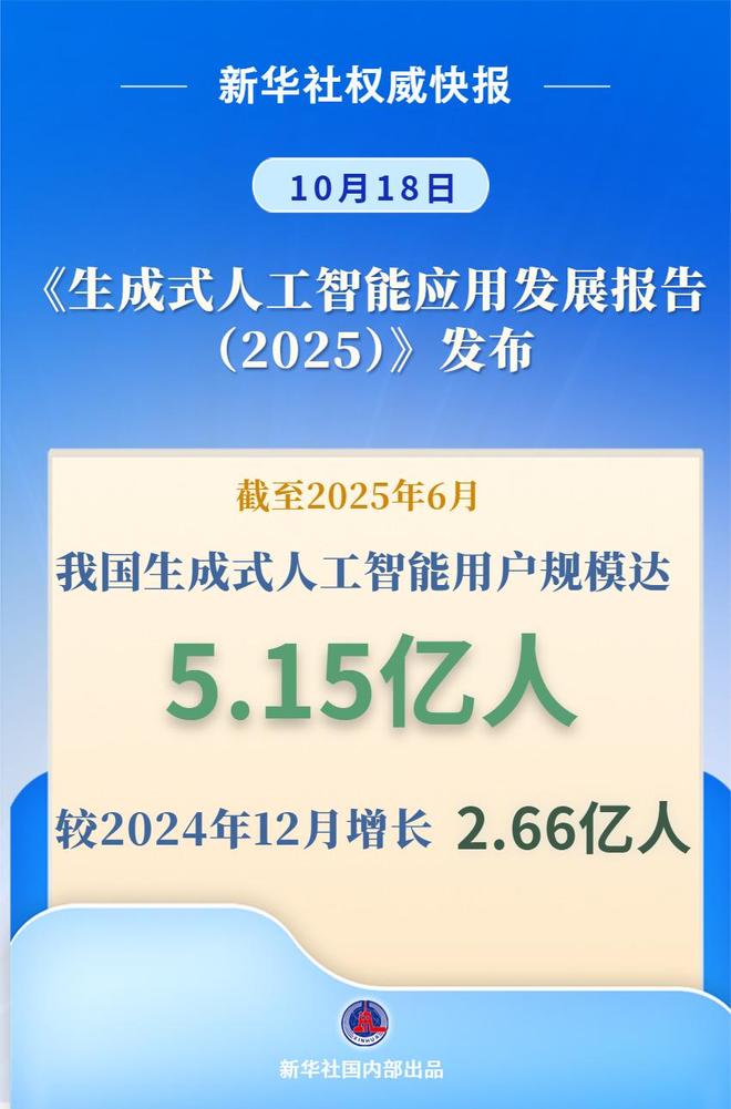新华社权威快报 10月18日 《生成式人工智能应用发展报告 (2025)》发布 截至2025年6月 我国生成式人工智能用户规模达 5.15 7 较2024年12月增长 2.66亿人 新华社国内部出品 记者:王思北 海报制作:王思北 新华社国内部出品 10月18日,中国互联网络信息中心在2025(第六届)中国互联网基础资源大会上发布《生成式人工智能 应用发展报告(2025)》。报告显示,截至2025年6月,我国生成式人工智能用户规模达5.15亿人,较 2024年12月增长2.66亿人,用户规模半年翻番;普及率为36.5%。 报告认为,国产生成式人工智能大模型得到用户广泛青睐,并推动各种应用场景下的智能化改造升级。 调查发现,超九成用户首选国产大模型。生成式人工智能被广泛应用于智能搜索、内容创作、办公助 手、智能硬件等多种场景,还在农业生产、工业制造、科学研究等领域得到积极探索实践。 ...
