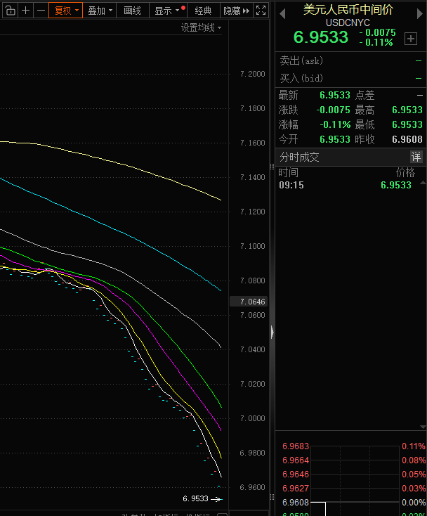 创32个月以来最高!人民币兑美元中间价报6.9533