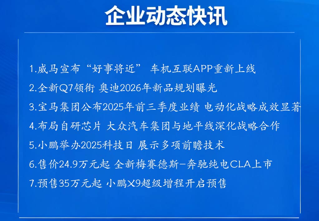 威马汽车动态 - 威马汽车在社交媒体发布“好事将近”海报,但随后删除该信息 [2] - 公司宣布旗下小威随行APP重新上线,该APP是车主专属智能应用 [2] - 技术团队已恢复APP主要功能,现支持威马EX5(可旋转小屏版)和威马EX6车型,更多车型适配工作将依法依规推进 [5] 奥迪产品规划 - 奥迪公布2026年产品规划,将推出三款新车:全新一代Q7、全新Q9及一款入门级纯电动车型 [5] - 全新Q7作为中大型SUV将进行设计和技术全面升级,预计提供更先进驾驶辅助系统和更优燃油经济性 [5] - Q9是品牌首款全尺寸SUV,将提供内燃机版本并可能引入插电混动选项 [5] - 全新入门级纯电动车有望复兴已停产A2车型,以扩展电动化产品线 [5] 宝马集团业绩 - 宝马集团2025年第三季度营业收入323.14亿欧元,汽车业务营收285.10亿欧元,同比增长2.4% [6] - 第三季度全球销量588,300辆,同比增长8.8%,前三季度累计销量1,795,894辆,同比增长2.4% [6] - 第三季度电动车销量151,282辆,同比增长8.0%,其中纯电动车销量102,864辆,同比下滑0.6% [6] - 前三季度电动车累计销量470,313辆,同比增长15.0%,其中纯电动车323,447辆,同比增长10.0% [6] - 宝马品牌第三季度销量514,620辆,同比增长5.7%,前三季度销量1,585,580辆,同比增长0.1% [7] - M高性能车第三季度销量52,220辆,同比增长11.0%,前三季度销量158,182辆,同比增长7.9% [7] - MINI品牌第三季度销量72,376辆,同比增长37.5%,前三季度销量206,214辆,同比增长23.7% [7] - 劳斯莱斯品牌第三季度销量1,304辆,同比增长13.3%,前三季度累计销量4,100辆,同比增长3.3% [7] 大众汽车集团合作 - 大众中国旗下CARIAD与地平线成立的合资公司酷睿程将在中国自主设计与研发系统级计算方案 [8] - 该方案旨在为大众的高级驾驶辅助和自动驾驶系统提供支持,是推进“在中国,为中国”战略的关键一步 [10] - 开发将整合大众全球工程经验与地平线软硬结合技术,打造以“智能高效”为目标的智能网联汽车“智慧大脑” [10] 小鹏汽车技术发布 - 小鹏举办第七届科技日,围绕“物理AI”发布四项重要应用,并宣布公司定位重大升级 [10] - 小鹏第二代VLA实现从视觉信号到动作指令的端到端直接生成,每五天全链路迭代一次 [12] - 第二代VLA大模型将面向全球商业伙伴开源,并计划于2026年第一季度面向小鹏Ultra车型全量推送 [12] - 公司计划2026年推出三款Robotaxi车型并启动试运营,将搭载4颗图灵AI芯片,车端算力达3000TOPS [12] - 全新人形机器人IRON搭载小鹏第二代VLA,拥有3颗图灵AI芯片,构建VLT+VLA+VLM高阶大小脑能力组合 [12] - 小鹏汇天发布全倾转固定翼飞行汽车“A868”,预计实现500km航程,最高航速360公里/小时,采用6人座舱设计 [12] 梅赛德斯-奔驰新车上市 - 全新梅赛德斯-奔驰纯电CLA正式上市,共推出3款配置,售价区间24.90万元至29.99万元 [13] - 新车全系标配星心相息封闭式格栅,前脸142颗星徽可呼吸式动态点亮,尾部采用贯穿式尾灯组 [13] - 内饰配备10.25英寸液晶仪表+14.6英寸中控屏+14英寸副驾娱乐屏三联屏设计,搭载MB.OS操作系统 [15] - 新车搭载89kWh电池组,全系标配800V平台和碳化硅逆变器,电池到车轮能量转换率达93%,最大CLTC续航866km,百公里能耗10.9kWh [15] - 配备两挡变速箱,1挡保障低扭输出,2挡控制电机高速行驶时转速降低一半以上,风阻系数0.21Cd [15] 小鹏X9超级增程预售 - 小鹏X9超级增程开启预售,预售价区间35万元-37万元,定位7座中大型MPV [15] - 新车搭载小鹏鲲鹏超级增程技术,采用800V高压平台,配备5C超快充,CLTC纯电续航452km,综合续航1602km [15] - 尺寸为5316x1988x1785mm,轴距3160mm,车身长度较纯电版有所增加 [17] - 内饰采用全新设计的方向盘,配备21英寸全景HUD,二排提供双零重力座椅,三排支持座椅调节和靠背折叠 [17] - 动力配备1.5T增程器+电机,发动机最大功率110kW,电机最大功率210kW,采用63.3kWh电池组+60L油箱组合 [17]