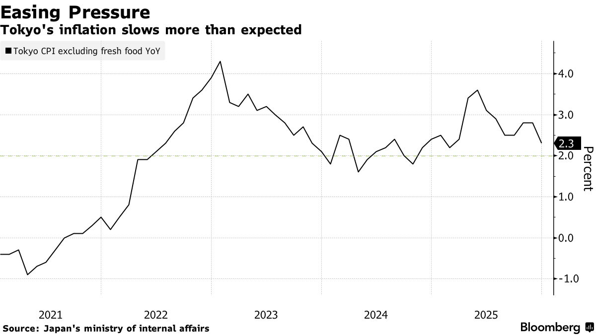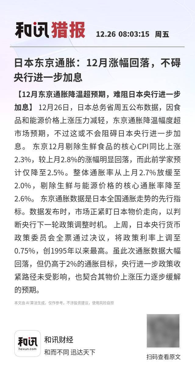 东京通胀数据 - 东京12月剔除生鲜食品的核心CPI同比上涨2.3%,较上月2.8%的涨幅明显回落[1] - 整体通胀率从上月2.7%放缓至2.0%[1] - 剔除生鲜与能源价格的核心通胀率降至2.6%[1] 市场预期与数据对比 - 此前学家预计核心CPI仅降至2.5%,实际2.3%的涨幅低于市场预期[1] - 东京通胀数据是日本全国通胀走势的先行指标[1] 日本央行政策背景 - 上周日本央行货币政策委员会全票通过决议,将政策利率上调至0.75%,创1995年以来最高[1] - 虽通胀数据大幅回落,但仍高于2%的通胀目标[1][3] - 央行进一步政策收紧路径未受影响,契合其物价上涨压力逐步缓解的预期[1][3] 通胀降温原因 - 因食品和能源价格上涨压力减轻,东京通胀降温幅度超市场预期[1]