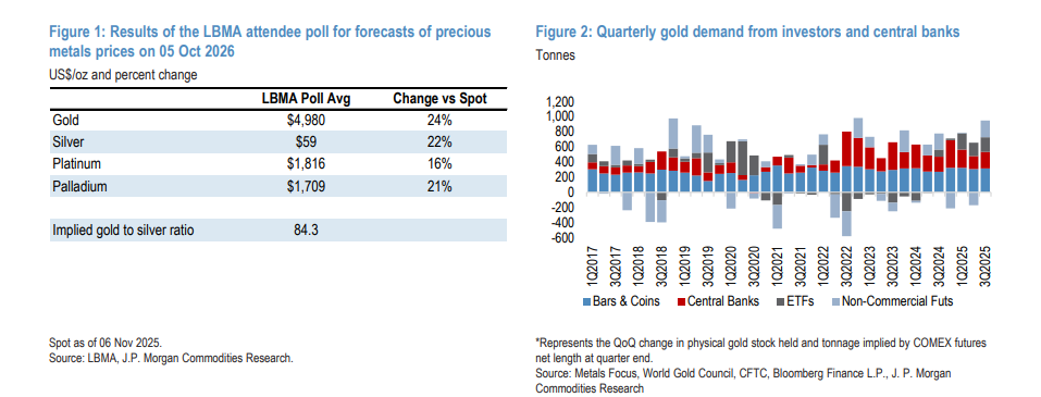 在金价经历一轮猛烈上涨并回调至约4000美元/盎司后,市场正处于一个关键的博弈阶段。 据追风交易台消息,摩根大通11月6日发布的最新研报认为,尽管金价近期回调,但机构投资者对黄金的中期前景依然看好,短期内则已获利了结并寻求 重新入场时机。 其在10月下旬参与伦敦金银市场协会(LBMA)全球贵金属会议并与亚洲客户交流后发现,市场普遍认为金价近期的回调是"健康的"。在经历了2025年第 三季度和10月初的爆炸性需求流入后,这种调整是必要且正常的。 根据该报告,与会者对金价的长期走势极为乐观,预测到2026年10月5日下一次LBMA会议时,金价平均将达到4980美元/盎司。 这一乐观情绪的背后,是2025年第三季度惊人的需求数据:投资者(包括ETF、期货、金条和金币)和央行的总需求量达到约950吨,按名义价值计算约 合1060亿美元,比此前四个季度的平均水平高出近50%。 | US$/oz and percent change | | | | --- | --- | --- | | | LBMA Poll Avg | Change vs Spot | | Gold | $4,980 | 24% | | Silver ...