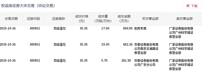 大宗交易概况 - 2025年10月16日,四会富仕发生大宗交易,总成交量为42万股,总成交额为1484.71万元,占当日总成交额的6.13% [1] - 成交价格为35.35元,较当日市场收盘价39.28元折价10.01% [1] 交易明细分析 - 当日共发生三笔大宗交易,成交价格均为35.35元 [2] - 第一笔成交量为17万股,成交额为600.95万元,买方为机构专用席位,卖方为广发证券股份有限公司广州科学城证券营业部 [2] - 第二笔成交量为19.3万股,成交额为682.26万元,买方为华泰证券股份有限公司南京文湖路证券营业部,卖方为广发证券股份有限公司广州科学城证券营业部 [2] - 第三笔成交量为5.7万股,成交额为201.50万元,买方为华泰证券股份有限公司广东分公司,卖方为广发证券股份有限公司广州科学城证券营业部 [2]
