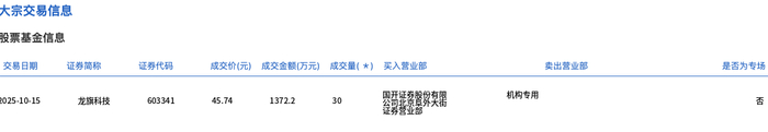 | 交易日期 | 证券简称 | 证券代码 | 成交价(元) 成交金额(万元) 成交量(*) 买入营业部 | | | | 卖出营业部 | 是否为专场 | | --- | --- | --- | --- | --- | --- | --- | --- | --- | | 2025-10-15 | 龙旗科技 | 603341 | 45.74 30 30 | 1372.2 | 图书记者觉好契据 | 机构专用 | | 180 | 10月15日,龙旗科技大宗交易成交30万股,成交额1372.2万元,占当日总成交额的2.51%,成交价45.74 元,较市场收盘价46.2元折价1%。 ...