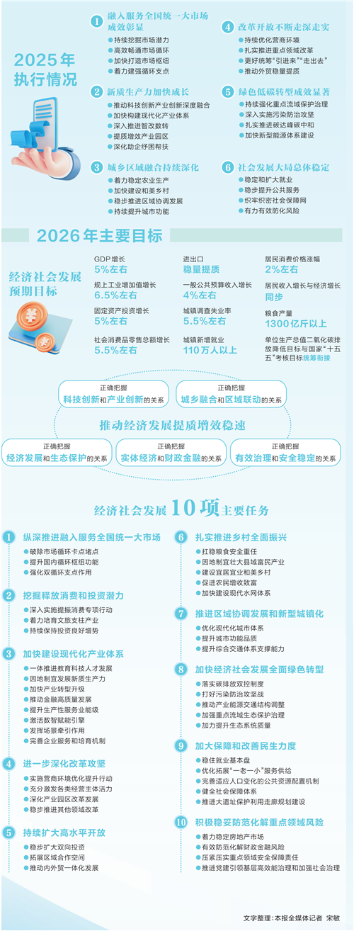 1月26日,广东省十四届人大五次会议在广州开幕,广东省省长孟凡利向大会作政府工作报告。报告提 出,今年的主要预期目标是:地区生产总值增长4.5%—5%,在实际工作中全力争取更好结果;地方一 般公共预算收入增长3%左右,居民收入增长与经济增长同步。 报告指出,2025年是中国式现代化进程中具有重要意义的一年,也是广东改革发展历程中很不平凡的一 年。数据显示,全年地区生产总值增长3.9%,总量连续37年居全国首位。预计全社会研发投入5350亿 元,研发投入强度达3.6%,"深圳—香港—广州"创新集群跃居全球首位。11家企业入选全球人形机器人 上市公司百强,全球灯塔工厂增至10家,国家卓越级智能工厂增至22家。新培育国家制造业单项冠军企 业47家、专精特新"小巨人"企业688家,预计高新技术企业达7.4万家、科技型中小企业达5.6万家。境内 外上市公司总量达1224家,上榜世界500强企业增至18家。 展望"十五五"时期,报告提出了经济社会发展的主要目标:地区生产总值年均增长5%左右,高质量发 展取得显著成效,科技自立自强水平大幅提高等。另外,从党的二十大到2035年,用13年时间基本实现 社会主义现代化,经济总量 ...