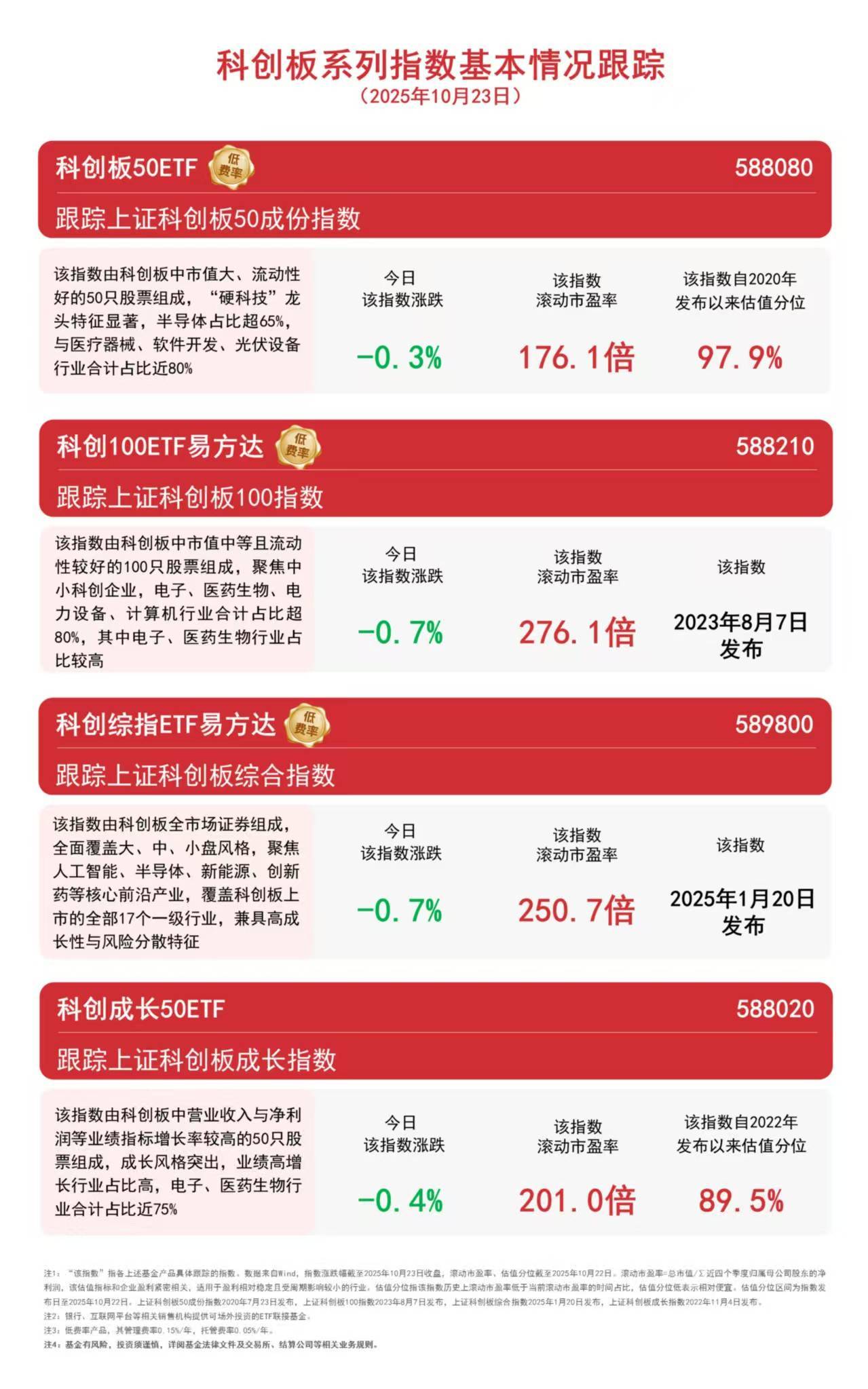 上证科创板50成份指数 - 指数由科创板中市值大、流动性好的50只股票组成,硬科技龙头特征显著 [2] - 指数成分行业集中度高,半导体占比超65%,与医疗器械、软件开发、光伏设备行业合计占比近80% [2] - 截至2025年10月23日,指数日涨跌幅为-0.3%,滚动市盈率为97.1倍 [2] 上证科创板100指数 - 指数由科创板中市值中等且流动性较好的100只股票组成,聚焦中小科创企业 [2] - 行业分布集中,电子、医药生物、电力设备、计算机行业合计占比超80%,其中电子和医药生物行业占比较高 [2] - 截至2025年10月23日,指数日涨跌幅为-0.7%,滚动市盈率为276.1倍 [2] 上证科创板综合指数 - 指数由科创板全市场证券组成,全面覆盖大、中、小盘风格 [3] - 指数聚焦人工智能、半导体、新能源、创新药等核心前沿产业,覆盖科创板上市的全部17个一级行业 [3] - 截至2025年10月23日,指数日涨跌幅为-0.7%,滚动市盈率为250.7倍 [3] 上证科创板成长指数 - 指数由科创板中营业收入与净利润等业绩指标增长率较高的50只股票组成,成长风格突出 [4] - 业绩高增长行业占比高,电子、医药生物行业合计占比近75% [4] - 截至2025年10月23日,指数日涨跌幅为-0.4%,滚动市盈率为201.0倍 [4] 相关ETF产品信息 - 存在跟踪上述指数的ETF产品,例如科创100ETF易方达、科创综指ETF易方达、科创成长50ETF [2][3][4] - 相关低费率产品的管理费率为0.15%每年,托管费率为0.05%每年 [5] - 银行、互联网平台等相关销售机构提供可场外投资的ETF联接基金 [5]