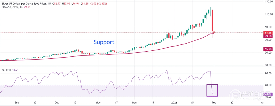 近期价格走势与市场情绪 - 白银价格在经历上周暴跌后,于亚洲交易时段谨慎交投于80美元附近,略高于上周五触及的四周新低73.33美元 [1][3] - 白银价格上周从121.66美元的历史高点重挫超过30%,目前正试图收复失地 [3] - 截至分析时,白银价格位于81.38美元,持稳于79.50美元的上升50日指数移动平均线上方,中期上行趋势得以维持 [8] 价格波动的主要驱动因素 - 价格暴跌的主要推动因素包括美元走强、强势反弹后的获利了结,以及市场对美联储鹰派货币政策前景的预期 [3] - 美元指数稳定维持在97.33的周高点附近,美元走强使白银对投资者而言成为一种不利的高风险高回报投资选择 [3] - 周五美元吸引大量买盘,部分原因是白宫提名前美联储主席凯文·沃什为现任主席杰罗姆·鲍威尔的继任者 [3] 美联储政策与关键人物影响 - 市场专家认为,凯文·沃什的当选不会削弱美联储的独立性,这一点此前一直备受期待 [3] - 凯文·沃什素以支持强势美元著称,其在美联储任职期间的政策倾向意味着未来货币政策环境可能继续保持紧缩 [4] - 此前,美国总统特朗普曾多次表示,新美联储主席将带来更多的降息举措 [3] 未来市场关注焦点 - 投资者正等待美国1月份的非农就业数据,以获取有关美联储货币政策前景的新线索 [2][5] - 本周,投资者将重点关注美国1月份的非农就业数据,该数据将影响市场对美联储货币政策前景的预期 [5] 技术分析观点 - 相对强弱指标位于44的中性区域,反映价格在经历超买状态后动能有所降温 [8] - 相对强弱指标低于50水平线,短期内压制白银价格上行空间;若反弹突破该分界线则将增强上涨动能 [8] - 若能持续守住50日指数移动平均线支撑,买盘或保持活跃;反之,若收盘价跌破该均线,则将加大下行风险 [8] - 若动量趋于稳定,多头或有望延续修复行情;反之,若未能实现重新加速,银价将继续维持区间震荡 [8] 市场数据 - 截至北京时间09:40,华通现货白银定盘价报23410元 [9]