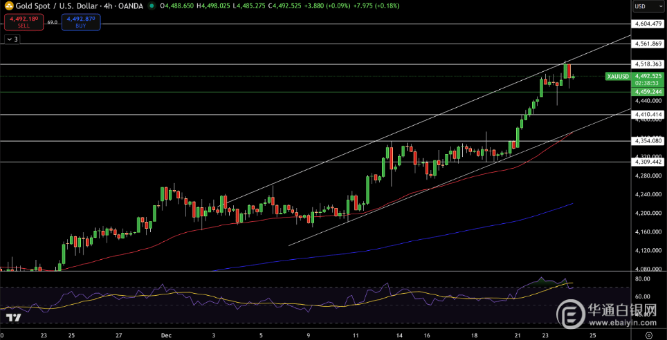 摘要今日周四(12月25日)亚盘时段,美盘现货黄金触及4526.15美元历史新高后小幅回落,收于4479.47 美元/盎司,或形成看跌收盘反转顶部形态。因圣诞假期临近,回落多为获利了结,非趋势逆转。美元 指数触数月低点后回升至97.927,走强或抑制金涨,但金价未现受压迹象。逢低买盘踊跃限制跌幅,若 次日确认反转或回调;否则在降息预期与央行购金支撑下,多头基调不改,守稳突破区间则看涨延续。 今日周四(12月25日)亚盘时段,美盘现货黄金触及4526.15美元历史新高后小幅回落,收于4479.47美元/ 盎司,或形成看跌收盘反转顶部形态。因圣诞假期临近,回落多为获利了结,非趋势逆转。美元指数触 数月低点后回升至97.927,走强或抑制金涨,但金价未现受压迹象。逢低买盘踊跃限制跌幅,若次日确 认反转或回调;否则在降息预期与央行购金支撑下,多头基调不改,守稳突破区间则看涨延续。 【要闻速递】 贝森特暗示美联储未来方向:通胀"区间制",取消"点阵图",支持财政部,回归"幕后"。 特朗普要求新任美联储主席坚定支持大幅降息,引导美联储未来降息和扩表预期。 德国与美国及日本和英国政府先后推出财政宽松政策,引导全球多国债务膨 ...