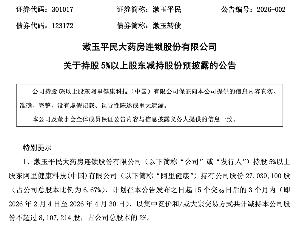 阿里健康新一轮减持计划 - 阿里健康科技(中国)有限公司作为漱玉平民持股5%以上股东,持有公司股份27,039,100股,占公司总股本比例为6.67% [1] - 阿里健康计划自公告发布之日起15个交易日后3个月内,以集中竞价和/或大宗交易方式合计减持不超过8,107,214股,占公司总股本的2% [1] - 其中,通过集中竞价方式减持不超过4,053,607股(占总股本1%),通过大宗交易方式减持不超过4,053,607股(占总股本1%)[1] - 减持原因为股东自身资金需求,股份来源为公司首次公开发行前取得的股份 [4] 阿里健康近期减持历史 - 2024年11月1日至2024年12月12日期间,阿里健康已完成一轮减持,合计减持股份7,040,900股,占公司总股本1.75% [4][5] - 该轮减持中,通过集中竞价交易减持4,023,500股(占总股本1.00%),减持均价为13.53元/股;通过大宗交易减持3,017,400股(占总股本0.75%),减持均价为11.69元/股 [5] - 该减持计划已于2025年1月23日届满并实施完毕 [4] 公司实控人及其他重要股东减持情况 - 公司控股股东、实际控制人、董事长李文杰于2025年10月13日至2025年11月25日,通过大宗交易方式减持8,047,200股,占总股本比例1.99%,占剔除回购后总股本比例2.00%,减持均价为9.85元/股 [5][6] - 持股5%以上股东、董事、高级管理人员秦光霞于2025年6月23日至2025年7月15日,合计减持12,070,100股,占总股本比例3.00% [6][7] - 秦光霞减持中,通过集中竞价交易减持4,022,900股(占总股本1.00%),均价12.52元/股;通过大宗交易减持8,047,200股(占总股本2.00%),均价11.36元/股 [7] 公司基本经营与市场表现 - 公司前身为济南漱玉保健品有限公司,成立于1999年1月,2002年5月开设第一家门店进军医药零售领域,于2021年7月在深交所创业板上市 [7] - 2025年前三季度,公司实现营业总收入74.46亿元,同比增长5.19%;归母净利润1.09亿元,同比实现扭亏为盈;扣非净利润940.46万元,同比亦实现扭亏 [7] - 截至2025年1月13日收盘,公司股价报19.43元/股,单日上涨10.15%,总市值约为78.76亿元 [8]