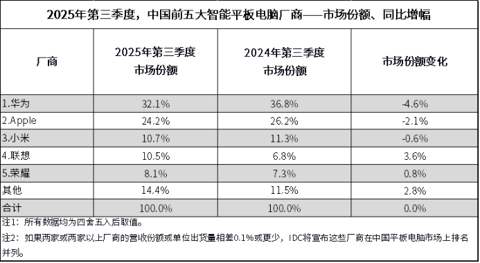 中国平板电脑市场整体表现 - 2025年第三季度中国平板电脑市场出货量为849万台,同比增长10.9% [1] - 前三大厂商华为、苹果、小米的市场份额均较去年同期出现下滑 [1] - 受“国补”政策效应减弱及部分省份政策收紧影响,预计年末市场增速将较前三季度有所放缓 [3] 联想在中国市场的表现 - 联想平板市场份额从2024年同期的6.8%跃升至10.5%,排名从行业第五升至第四 [1][2] - 消费市场Y700系列领跑10英寸以下小尺寸细分赛道,新推出的小新平板12.1与小新Pro GT完善了主流尺寸段产品布局 [2] - 商用市场依托在教育与大型企业客户领域的深耕,保持稳定的出货增长 [2] 全球平板电脑市场格局 - 2025年第三季度全球平板出货量同比增长5%至4004.1万台,实现连续第七个季度增长 [3][4] - 联想平板以23%的同比出货量增长率领跑行业,超越华为重返全球平板市场第三位,市场份额为9.1% [3][4] - 联想成为全球前五大平板厂商中增速最高的品牌 [3] 联想增长驱动因素 - 在Chromebook细分市场以54.6%的同比增长率领跑 [3] - 高增长得益于AI技术对终端产品的全面赋能,公司通过与NVIDIA和Intel等伙伴合作推动平板向“AI终端”转型 [4] - 硬件性能、场景化应用及软件生态方面的持续优化为市场注入增长潜力 [3]