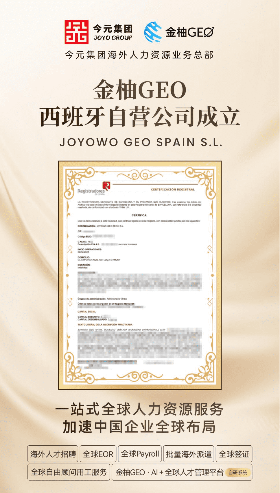 公司战略与业务进展 - 今元集团旗下金柚GEO正式成立西班牙自营公司 这是其全球化战略在欧洲市场的关键落子 标志着其欧洲服务网络向全域覆盖目标实现阶段性升级 [1] - 此举旨在为中国企业进军西班牙及辐射南欧 西欧乃至拉美市场 提供全链路 高适配 专业化的人力资源解决方案 [1] - 公司已在土耳其 迪拜 沙特 匈牙利等多地完成战略布局 此次设立西班牙公司是其全球跨境人力资源服务网络构建的进一步深化 [1][14] 西班牙市场战略价值 - 西班牙是欧盟核心成员国与南欧区域经济枢纽 成为中国企业出海欧洲的重要门户与战略支点 [4] - 地理上 西班牙是连接欧洲 非洲 拉美三大市场的天然桥梁 也是中企依托欧盟市场辐射全球的重要门户 [4] - 经贸上 中西建立全面战略伙伴关系20年 2024年双边货物贸易额已突破500亿美元 双向投资额累计超110亿美元 合作领域包括农产品与食品 新能源汽车 动力电池 机械制造 数字经济等 [4] - 《中华人民共和国和西班牙王国关于加强全面战略伙伴关系的行动计划(2025-2028年)》的制定和实施 为未来协作构筑起坚实框架 [4] - 西班牙在新能源 高端制造领域产业吸引力强 例如宁德时代建设超级电池工厂 远景动力布局30GWh磷酸铁锂电池项目 [6] - 作为欧盟单一市场 中企在西班牙布局可直接对接欧盟统一市场规则 享受关税减免 物流协同 市场互通等多重优势 [6] 中企在西班牙面临的人力资源挑战 - 合规用工层面 外籍员工工作与居留许可审批流程监管严格 对跨境用工合规管控要求极高 [6] - 人才供给层面 新能源 高端制造 数字经济等领域技术型人才供需失衡 且存在跨文化适配 职业理念差异等隐性挑战 [6] - 商业环境层面 西班牙不同地区商业文化差异显著 建立商业合作需先构建个人信任关系 为中企商务谈判 团队管理与本地融合带来阻碍 [6] - 数据与薪酬合规层面 西班牙严格遵循GDPR 企业在人才信息处理上若有疏漏可能面临行政处罚 同时薪酬核算需适配欧元区复杂税务体系 传统人工操作易出现误差 [7] - 全球人才数据割裂 导致跨境人才调配效率低下 管理成本高企 [7] 金柚GEO提供的解决方案 - 构建全链条跨境人力资源服务体系 提供海外人才招聘 全球EOR(名义雇主) 全球Payroll(薪酬服务) 批量海外派遣 全球签证 全球自由顾问用工等全流程服务 [9] - 在招聘端 依托全球化人才资源 精准匹配本地技术型人才与基础岗位员工 [9] - 在薪酬端 支持欧元等多币种即时发薪 深度适配西班牙本地化薪酬结构 社保体系与税务规则 [9] - 在服务端 通过EOR模式帮助企业快速实现本地业务布局 降低准入门槛与运营成本 缩短出海落地周期 [9] - 打造本土化专业服务团队 提供深谙西班牙劳动法规 区域商业文化 产业发展特征与人才市场规律的服务 包括居留许可办理 劳动合同本地化起草 跨文化沟通技巧及商务礼仪培训等 [10] - 联动在欧洲其他国家的服务资源 实现区域人才资源互通 服务经验共享 合规标准统一 [10] - 以AI技术驱动 依托自研的「金柚GEO・AI+全球人才管理平台」 AI政策中枢24小时实时监测西班牙劳动法规与欧盟政策动态 推送合规预警 [10] - 平台通过企业 人员 服务端三端协同审核机制 实现人才信息自主录入与安全管控 并完成员工入离职办理 假期本土化适配 薪酬核算发放等流程 支持审批流自定义 实现用工状态实时掌控与三端数据自动同步 [10] - 平台适配欧元区税务体系 精准降低薪酬核算误差 大幅降低管理成本 [10] - 深化生态协同 与集团旗下企业培训及咨询品牌今元橙长深度联动 共享出海生态资源 依据企业出海扩张路径 构建覆盖出海“认知准备-决策启动-试点探索-规模扩张-调整回收”五阶段的定制化培训与咨询服务体系 [12] 未来展望 - 公司将以西班牙自营公司的成立为契机 进一步完善欧洲服务网络布局 强化本地化服务能力与技术创新能力 [14] - 通过数字化能力与本土化服务优势的深度融合 助力更多中国企业在欧洲市场稳健高效发展 [14]
