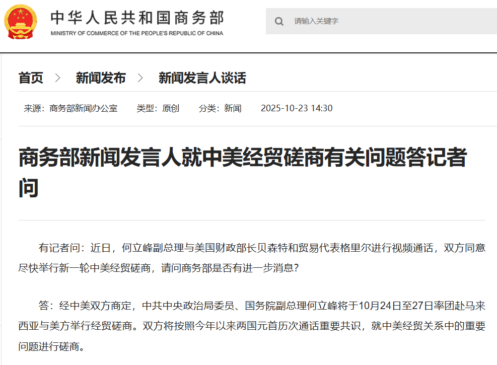 商务部新闻发言人就中美经贸磋商有关问题答记者问。 来源: 人民日报客户端 欢迎分享给你的朋友! 出品 | 中国能源报(c n e n e rg y) End 编辑 | 闫志强 有记者问:近日,何立峰副总理与美国财政部长贝森特和贸易代表格里尔进行视频通话, 双方同意尽快举行新一轮中美经贸磋商,请问商务部是否有进一步消息? 答:经中美双方商定,中共中央政治局委员、国务院副总理何立峰将于10月24日至27日 率团赴马来西亚与美方举行经贸磋商。双方将按照今年以来两国元首历次通话重要共识, 就中美经贸关系中的重要问题进行磋商。 ▲ 商务部网站截图 ...