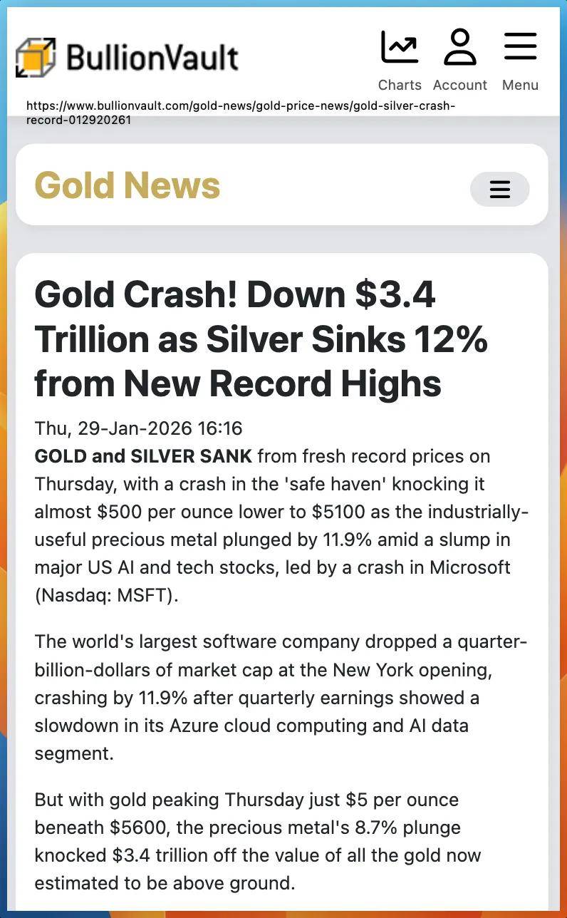 市场行情与价格波动 - 2025年1月30日,全球贵金属市场经历史诗级暴跌,创下1980年以来单日最大跌幅[3] - 黄金价格从2025年初的每盎司2600美元左右,一路冲高至1月29日的5600美元,随后在1月30日交易中一度下跌超过12%,跌破每盎司5000美元关键心理关口[3][14][15] - 白银价格从每盎司30美元附近飙升至114美元以上,随后在1月30日盘中最大跌幅达到36%,几乎将去年的涨幅在一夜之间腰斩[4][16][17] 市场情绪与交易行为 - 市场前期上涨的底层逻辑是投资者对美元失去信心,因通胀压力、地缘争议和央行宽松政策,将贵金属视为避险资产[4] - 黄金的相对强弱指数(RSI)一度冲至90以上,表明市场已严重超买[10][11] - 市场主流交易曾为“做空美元、做多贵金属”,仓位较重,消息面反转后引发大规模获利了结、止损和强制平仓[25] - 期权市场的“伽玛挤压”(Gamma Squeeze)现象前期推高了价格,价格反转后机构的对冲抛售行为加剧了下跌[25] 关键触发事件与影响 - 价格暴跌的直接触发事件是对凯文·沃什(Kevin Warsh)被提名出任下一任美联储主席的预期[21][22] - 该提名被市场解读为美联储货币政策可能转向鹰派,倾向于更早加息并更强硬地对抗通胀,而非持续宽松[25] - 此预期导致美元指数大涨,削弱了以美元计价的黄金和白银的吸引力[25] 行业参与者表现 - 矿业巨头公司股价受到严重冲击,例如纽蒙特矿业(Newmont)和巴里克矿业(Barrick)的股价在事件中直接跳水超过10%[19] 市场观点分歧 - 悲观观点认为此次崩盘可能标志长达一年的贵金属牛市终结,因鹰派美联储主席可能导致高利率维持更久,削弱无息资产黄金的吸引力[25] - 乐观观点指出,尽管暴跌,黄金在1月份累计仍上涨13%,白银上涨19%,表明市场“家底”厚实[25] - 部分分析师认为,若新任主席主张通过提高生产力来对抗通胀并实现经济增长,黄金作为避险资产的中长期逻辑可能并未改变[25] 当前市场状态与展望 - 当前贵金属市场流动性非常脆弱,价格波动已脱离基本面,进入非理性博弈阶段[25] - 市场未来走向的关键不确定性在于,被提名人凯文·沃什在参议院听证会上的表态及其未来货币政策的实际执行力度[25][26]