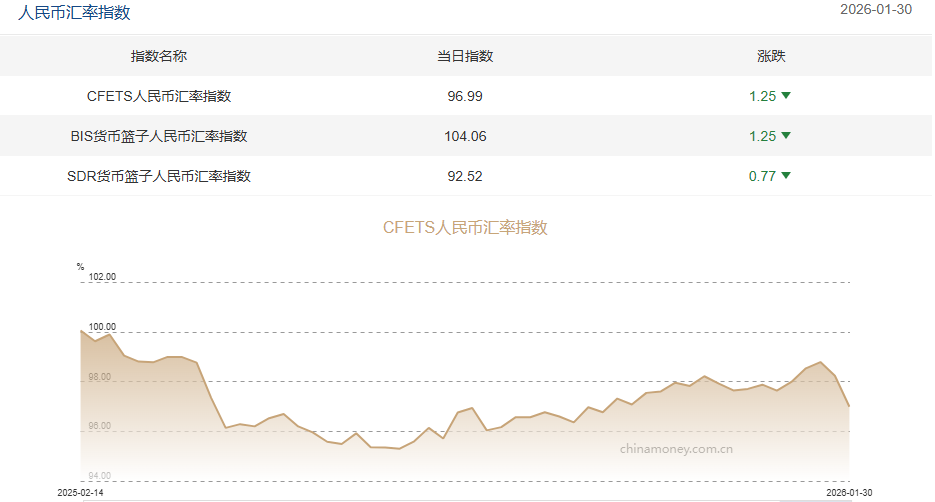 图为截至1月30日三大人民币汇率指数。来源:中国外汇交易中心 国际方面:特朗普正式提名前美联储理事凯文·沃什接替鲍威尔出任下任美联储主席。该提名需参议院批准,但民主党领袖舒默与共 和党参议员蒂利斯已明确表示,除非撤销对鲍威尔的调查,否则将联手阻止沃什上任。 此外,美联储将基准利率维持在3.50%-3.75%不变,结束自去年9月以来的连续三次降息。尽管符合市场预期,但政策声明透露出内 部意见分化:理事米兰和沃勒投下反对票,主张降息25个基点。 新华财经北京2月2日电中国外汇交易中心最新计算的2026年1月30日CFETS人民币汇率指数为96.99,按周跌1.25%;BIS货币篮子人民 币汇率指数报104.06,按周跌1.25%;SDR货币篮子人民币汇率指数报92.52,按周跌0.77%。 中国人民银行副行长邹澜在第19届亚洲金融论坛上表示,中国人民银行持续推进内地与香港金融市场互联互通机制,全面覆盖债 券、股票、货币衍生品、黄金等多个子市场,有效支持全球投资者通过香港开展人民币投融资活动。邹澜表示,香港已成为全球最 大、最具影响力的人民币离岸业务枢纽。 近日,中国人民银行与斯里兰卡央行签署人民币清算安排合作备忘 ...
