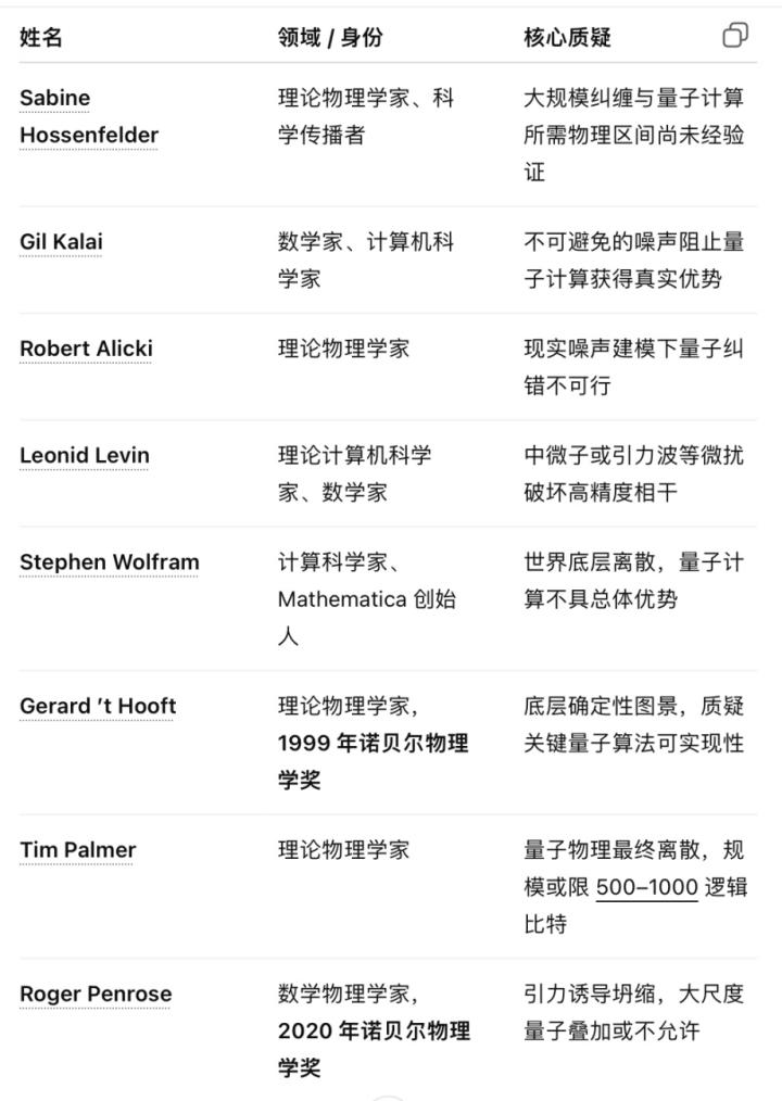 文章核心观点 - 量子计算领域正从单一的乐观叙事转向更审慎和多元的公共讨论 科学进步需要持续的质疑与反思 本文旨在回应批评并对关键议题进行深度补遗 [1] 对量子计算的质疑来源 - 对量子计算的质疑并非来自外行或边缘声音 而是由一批在理论物理与计算基础领域具有一流水准的专家提出 其中包括两位诺贝尔奖获得者 [2] - 质疑观点被系统性地整理并呈现给公众 传播者Sabine Hossenfelder本身受过完整的理论物理训练并长期从事相关基础问题研究 并非缺乏专业背景 [2][4] - 科学讨论应关注观点本身的逻辑与证据 而非传播者的身份和立场 [4] 主要专家质疑要点 - Sabine Hossenfelder质疑大规模纠缠与量子计算所需的物理区间尚未经验证 [3] - Gil Kalai认为不可避免的噪声会阻止量子计算获得真实优势 [3] - Robert Alicki指出在现实噪声建模下量子纠错不可行 [3] - Leonid Levin担心中微子或引力波等微扰会破坏高精度相干 [3] - Stephen Wolfram认为世界底层是离散的 量子计算不具总体优势 [3] - Gerard 't Hooft基于底层确定性图景 质疑关键量子算法的可实现性 [3] - Tim Palmer提出量子物理最终是离散的 规模可能限制在500-1000逻辑比特 [3] - Roger Penrose认为引力诱导坍缩可能不允许大尺度量子叠加 [3] 中国物理学家的观点与行业路径反思 - 国内顶级高校物理系教授指出 当前量子计算的发展路径正在回归费曼1980年提出的原始构想 即用量子系统模拟量子系统(量子模拟) 这与过去宣传的“通用量子计算”和“指数级算力跃迁”等宏大目标已拉开显著距离 [5] - 另一位评论者将问题归结于物理世界的根本约束 认为理想的、极低温极高隔离度的量子系统在严格意义上并不存在 系统规模扩大后热力学效应将不可避免 挑战来自物理本身的结构性约束而非工程细节 [6] - 这些来自不同学术环境的独立判断表明 对量子计算的质疑是持续且普遍的 是对物理边界外推的理性反思 [5][6]