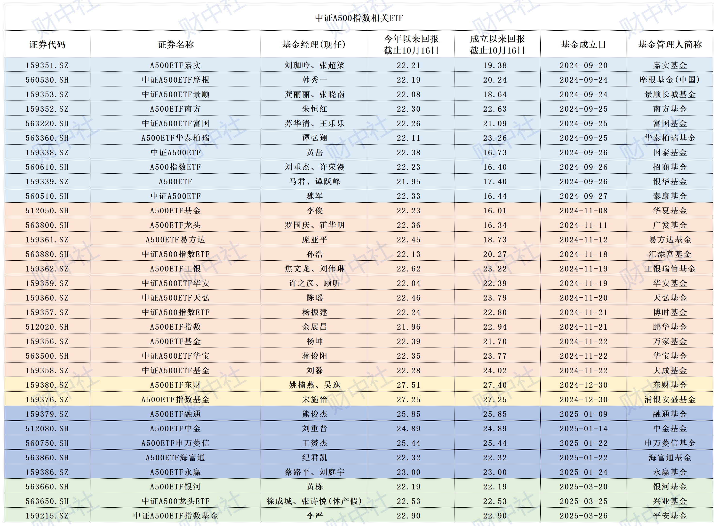 中证A500指数概况 - 指数规模从200亿元迅速增长至3000亿元,成为A股第二大核心宽基指数 [1] - 作为新"国九条"后首个核心宽基指数,承载中盘蓝筹、产业升级与结构转型的市场预期 [1] - 公募产品体系日趋完善,参与机构超过80家,累计规模突破3000亿元 [1] - 截至10月16日,A500ETF整体收益稳健,而指增基金业绩头尾分化超过30个百分点 [1] ETF产品表现 - 32只中证A500ETF今年以来平均回报约为22.9%,成立以来平均回报约21.6% [2] - 中证A500指数过去一年上涨23.05%,跑赢沪深300指数(19.77%) [2] - 首批10只ETF成立于2024年9月,成立以来回报区间为19.3%~23.3%,平均约21.4% [2] - 第二批12只产品成立于2024年11月,平均回报约19.6% [2] - 第三批产品成立于2024年12月至2025年1月,回报进一步抬升至23%以上 [2] - 华泰柏瑞A500ETF(563360.SH)规模达249亿元,位居全市场首位 [6] - 易方达与南方基金旗下A500ETF规模均突破200亿元 [6] - 全市场32只产品的平均机构持有比例高达90% [6] 指数增强基金表现 - 全市场超过50只A500指增基金今年以来平均回报约15.94% [7] - 最高与最低回报之间相差超过30个百分点 [7] - 汇添富中证A500指数增强A(023298.OF)表现最为突出,今年以来回报31.27% [7] - 2025年3月成立的指增基金年内回报平均值为21.7%,首尾差距超15个百分点 [7] - 摩根中证A500指数增强A(023869.OF)成立满月回报-0.09%,显著跑输同期指数1.53%的涨幅 [8] 指数特征与市场地位 - 截至2025年10月17日,A500指数基金总规模达3193亿元 [12] - 成分股覆盖中证二级行业100%、三级行业98%,是最全面反映中国经济结构的宽基指数之一 [12] - "专精特新"企业占比超过35%,科技制造板块市值权重合计超30% [12] - 低配银行、非银金融等传统行业,超配电子、新能源、医药与高端制造 [12] - 德国资产管理机构DWS宣布将在欧洲发行首只跟踪中证A500指数的ETF [12] 市场展望 - 中盘龙头具备更高成长弹性,A500指数有望继续成为资金布局重点 [13] - 市场的短期波动主要源自情绪与外部扰动,中长期逻辑在于基本面改善和盈利修复 [13] - A500系列不仅是新的宽基标尺,更是一场关于资产定价与公募能力的现实考验 [13]