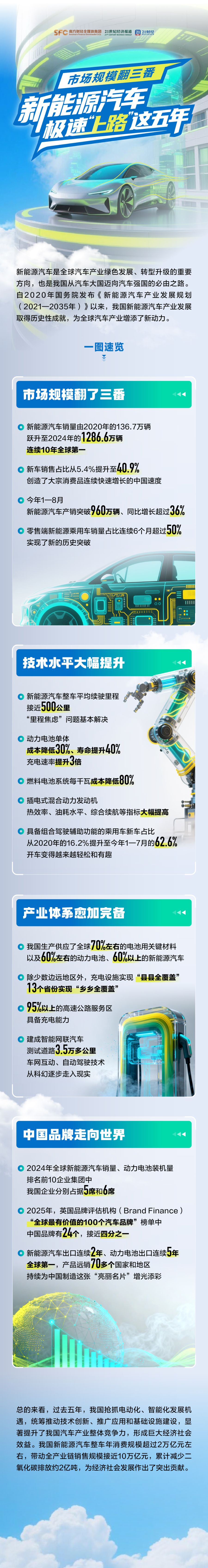 财经全媒体集团 21世纪经济报道 21 21财经 TFTI 新能源汽车是全球汽车产业绿色发展、转型升级的重要 方向,也是我国从汽车大国迈向汽车强国的必由之路。 自2020年国务院发布《新能源汽车产业发展规划 ( 2004 2025年) \ 川立 井田本台北海道大立山中国 (2021-2000年) // 以木; 找四机能源/ +F 业及成 取得历史性成就,为全球汽车产业增添了新动力。 ● 新能源汽车销量由2020年的136.7万辆 跃升至2024年的 1286.6万辆 连续10年全球第- ● 新车销售占比从5.4%提升至40.9% 创造了大宗消费品连续快速增长的中国速度 ● 今年1-8月 新能源汽车产销突破960万辆、同比增长超过36% ● 零售端新能源乘用车销量占比连续6个月超过50% 实现了新的历史突破 技术水平大幅提升 ● 新能源汽车整车平均续驶里程 接近500公里 "里程焦虑"问题基本解决 产业体系愈加完信 ITER Fit 市场规模副了三番 中国品牌走向世界 ◎ 除少数边远地区外,充电设施实现"县县全覆盖" 13个省份实现"乡乡全覆盖" o 95%以上的高速公路服务区 具备充电能力 ◎ 2024年全球 ...