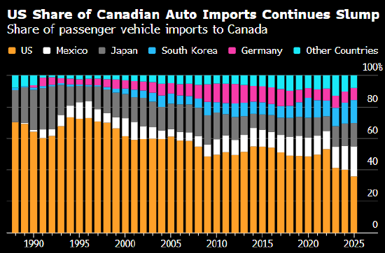 美国制造汽车在加拿大汽车市场的占比跌至新低,汽车关税颠覆了数十年来享有紧密跨境一体化的汽车 行业。 根据加拿大统计局的进口数据,2025年前10个月,加拿大进口的乘用车中只有36%是在美国制造的。相 比之下,此前10年的平均占比为49%。 加拿大是美国制造的新车和卡车的最大买家。但这些数据凸显了特朗普政府发动的贸易战如何改变了行 业格局。墨西哥和韩国制造的汽车在加拿大汽车经销商的销售份额越来越大。 美国制造汽车在加拿大汽车市场的占比跌至新低,汽车关税颠覆了数十年来享有紧密跨境一体化的汽车 行业。 根据加拿大统计局的进口数据,2025年前10个月,加拿大进口的乘用车中只有36%是在美国制造的。相 比之下,此前10年的平均占比为49%。 加拿大是美国制造的新车和卡车的最大买家。但这些数据凸显了特朗普政府发动的贸易战如何改变了行 业格局。墨西哥和韩国制造的汽车在加拿大汽车经销商的销售份额越来越大。 特朗普在4月对外国制造的汽车征收关税,促使加拿大对美国汽车和卡车实施报复性关税。不过,加拿 大政府对仍在安大略省生产车辆的汽车制造商给予了一些豁免,例如丰田汽车和通用汽车。 责任编辑:何云 特朗普在4月对外国制造的汽车征 ...