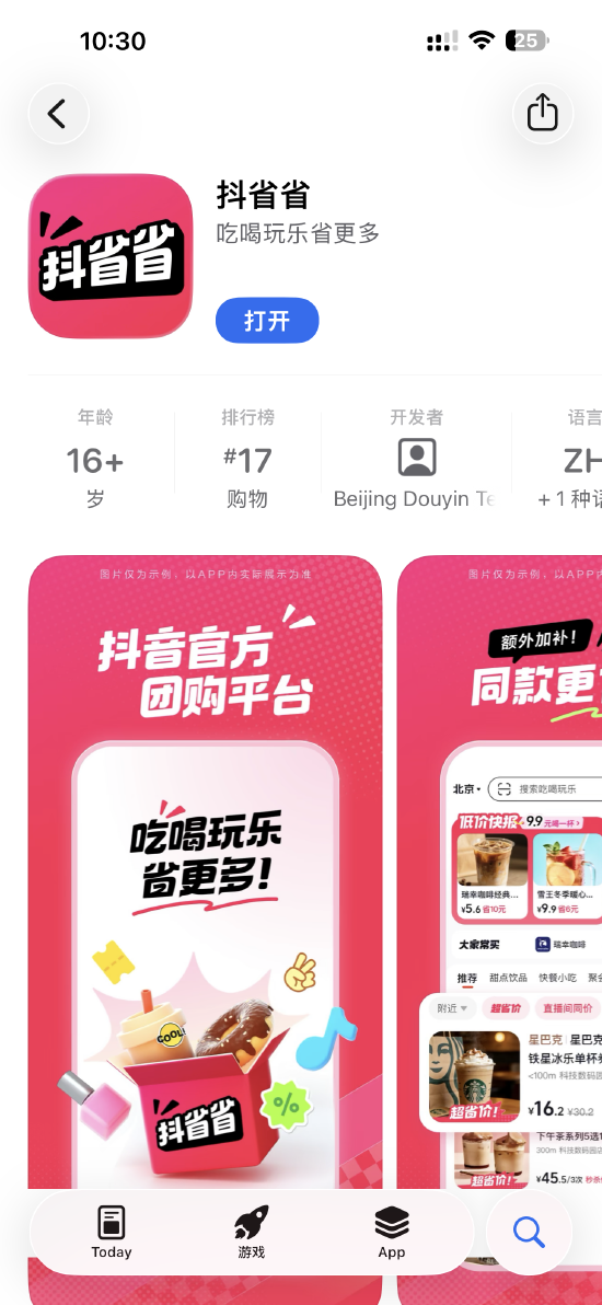 抖音上线官方团购App“抖省省”,覆盖甜点饮品、快餐小吃、超市购物、休闲娱乐等品类