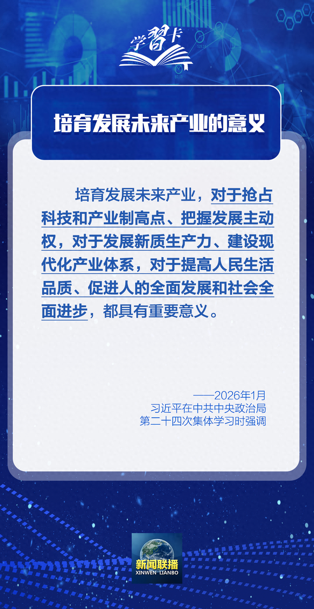 未来产业发展的战略定位与总体要求 - 新一轮科技革命和产业变革加速演进,前沿技术不断涌现,引领和支撑未来产业快速崛起 [1] - 发展未来产业需站在推进强国建设、民族复兴伟业的战略高度,立足客观条件,发挥比较优势,坚持稳中求进、梯度培育 [1] - 未来产业具有前瞻性、战略性、颠覆性等特点,需要科学谋划、全局统筹 [4] 未来产业发展的主攻方向与路径 - 要聚焦“十五五”时期我国未来产业发展的主攻方向,科学论证技术路线,提升前沿技术战略预判能力 [5] - 需综合考虑国家战略需求、技术成熟程度、要素支撑条件等因素,因地制宜、错位发展 [5] - 要强化产业协同,推动未来产业同新兴产业、传统产业相得益彰 [5] 加快科技突破的核心作用 - 科技突破的程度,很大程度上决定未来产业发展的速度、广度、深度 [6] - 要充分发挥新型举国体制优势,坚持“产业出题、科技答题”,加大重点领域关键核心技术攻关力度 [7] - 需加强基础研究战略性、前瞻性、体系化布局,加快科技成果转化应用 [7] 企业在未来产业发展中的主体作用 - 很多未来产业的兴起是靠企业一步步突破带动的,要发挥企业主体作用 [8] - 需推动各类创新资源向企业集聚,大力培育核心技术领先、创新能力强的科技领军企业和高新技术企业 [8] - 目标是引领带动产业向前沿和高端领域迈进 [8] 政府支持与服务体系构建 - 未来产业培育周期长、市场风险大,政策上要支持,政府要做好服务 [9] - 要完善财税等政策,大力发展科技金融 [9] - 需全方位做好人才培养、引进、使用工作,在全社会营造鼓励创新的浓厚氛围 [9][10] 未来产业治理体系与国际合作 - 未来产业发展涉及面广,必须健全治理体系,要统筹发展和安全,探索科学有效的监管方式,防范相关风险,确保既“放得活”又“管得好” [11] - 要深化国际合作,积极推动各方标准共建、规则共商、产业共促 [11] - 各级领导干部要加强科技前沿知识学习,努力做到知科技、懂产业、善决策 [11]
