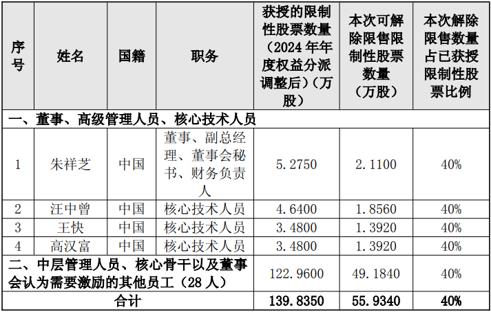10月16日,井松智能(688251)发布公告,关于2024年限制性股票激励计划第一个解除限售期解除限售 暨上市流通的事项。 2025年中期,井松智能实现收入3.57亿元,归母净利润50万元。 | 获授的限制 | | | | | 本次可解 | 本次解除 | | --- | --- | --- | --- | --- | --- | --- | | 性股票数量 | | | | | 除限售限 | 限售数量 | | ਮੇ | 姓名 | 国籍 | 职务 | (2024 年年 | 制性股票 | 占已获授 | | 법 | | | | 度权益分派 | | | | | | | | | 数量 | 限制性股 | | 调整后)(万 | | | | | (万股) | 票比例 | | | | | | 股) | | | | 一、董事、高级管理人员、核心技术人员 | | | | | | | | 董事、副总经 | | | | | | | | 1 | 朱祥芝 | 中国 | 理、董事会秘 | 5. 2750 | 2. 1100 | 40% | | 书、财务负责 | | | | | | | | < | | | | | | | | 2 | 汪中曾 ...