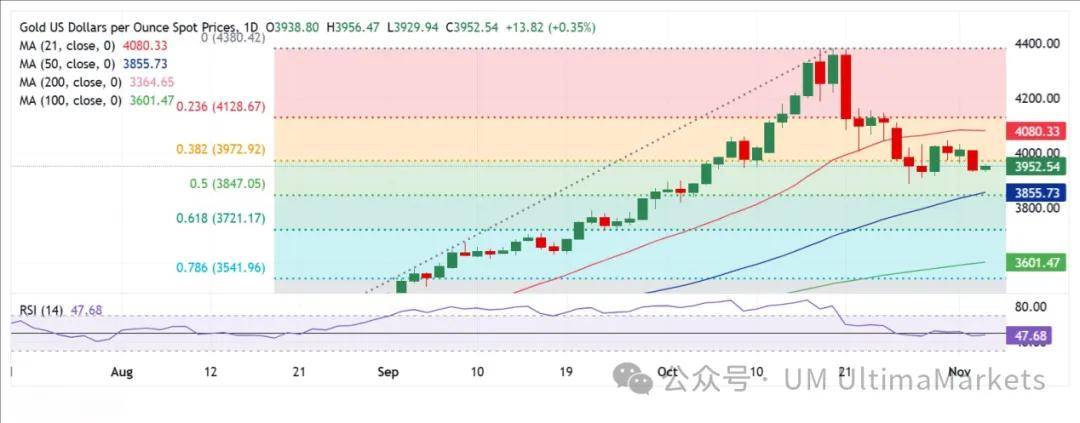 今日Ultima Markets为您带来了 2025年11月5日的黄金深入分析 ·黄金在周三早盘尝试温和反弹至3950美元附近。 ·美元在全球风险抛售引发的上涨后进入看涨盘整阶段。 周二,由于美联储的鸽派预期降低和广泛的风险厌恶复甦了对美元的避险需求,美元获得了双重提振,延续了近期的反弹。 交易者在全球股票因人工智能(AI)驱动的创纪录反弹后经历了一波疲惫。美国科技股暴跌,拖累主要指数,投资者出售黄金以弥补股市的损失。 黄金恢复了其修正下行,放弃了关键支撑位,挑战3950美元以下的水平。 黄金价格技术分析:日线图 ·从技术上看,黄金的最小阻力路径似乎向下。 在周三的亚洲交易中,黄金在3950美元附近舔舐伤口,此前周二下跌了1.80%。交易者期待美国ADP就业数据和美国ISM服务业PMI报告,以寻找新的交 易动力。 黄金:在美国数据公布前下行风险依然存在 周三早盘,黄金买家稍微喘口气,因为美元(USD)暂停了在美国上个交易日所见的强劲买入势头。 华尔街科技股的抛售延续至亚洲市场,使投资者保持紧张,黄金尝试温和反弹。 然而,月度美国ADP就业报告和美国ISM服务业PMI将决定黄金的下一波大行情,因为这些数据将帮助 ...