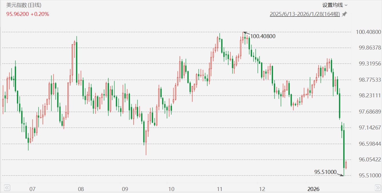 美元指数表现 - 美元指数于1月27日持续走低,尾盘大幅下跌,降至近4年来低点 [1] - 美元指数当天下跌0.84%,收于96.219,随后进一步下跌至95.55,创2022年2月中旬以来新低 [1] - 美元指数中权重最大的欧元对美元汇率自2021年以来首次站上1.20整数关口 [1] 市场驱动因素 - 美国总统特朗普表示不认为美元已下跌过度,并对当前美元表现予以肯定,这一表态进一步刺激美元指数快速下跌 [1] - 市场猜测美国和日本或联手进行了汇率询价操作,可能联合干预外汇市场,这一预期刺激日元对美元近期大幅走强 [1] - 凯投宏观副首席市场经济学家指出,美元下跌的主要驱动因素是市场预期美国财政部在考虑对外汇市场进行干预 [1] - 剑桥全球支付公司首席市场策略师表示,美国关税政策无后悔迹象,且政府可能再次“停摆”,导致经济政策不确定性大幅升高,促使“卖出美国”交易再次升温 [1]