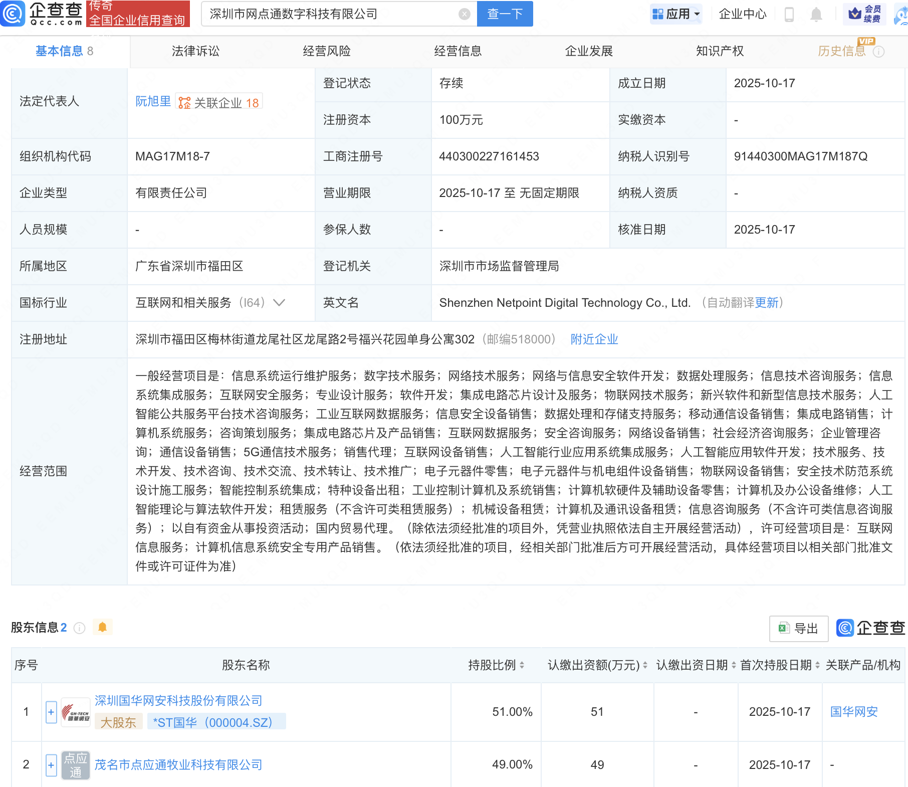 股东信息2 ① ● 企查查APP显示,近日,深圳市网点通数字科技有限公司成立,法定代表人为阮旭里,经营范围包含:集成电路芯片设计及服务;物联网技术服务;新兴软 件和新型信息技术服务;人工智能应用软件开发等。企查查股权穿透显示,该公司由*ST国华(000004)等共同持股。 | 序号 | 股东名称 | | 持股比例 ៖ | | --- | --- | --- | --- | | | 深圳国华网安科技股份有限公司 | | 51.00% | | | 大股东 | *ST国华 (000004.SZ) | | | 2 | 茂名市点应通牧业科技有限公司 | | 49.00% | | 企章查 传奇 文章章 传国企业信用章询 作者: | 深圳市网点通数字科技有限公司 | | × 査一下 | | --- | --- | --- | --- | | 基本信息 8 | 法律诉讼 | 经营风险 | 经营信息 | | 法定代表人 | 阮旭里 饶 关联企业 18 | 登记状态 | 存续 | | | | 注册资本 | 100万元 | | 组织机构代码 | MAG17M18-7 | 工商注册号 | 440300227161453 | | 企业 ...