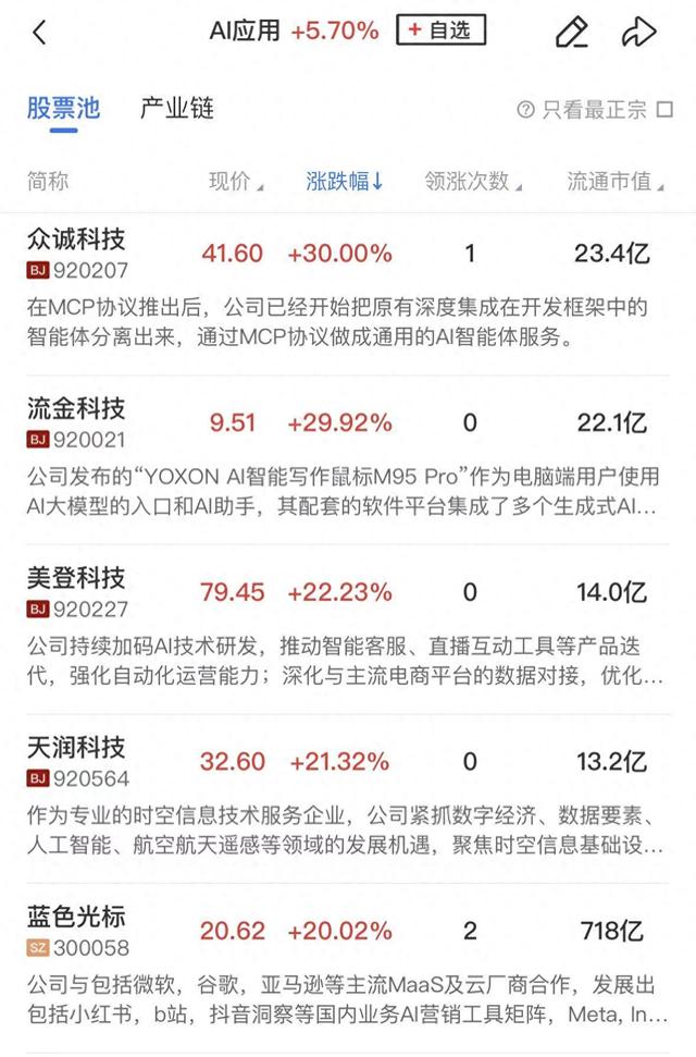 市场整体表现 - 截至收盘,沪指涨0.75%,深成指涨1.31%,创业板指涨1.17%,创业板指盘中一度跌超1%后探底回升 [1] - 市场量能持续放大,沪深两市半日成交额达2.31万亿元,较上个交易日放量2455亿元 [1] - 市场呈现普涨格局,全市场超3800只个股上涨,其中139只个股涨停 [1] 行业与板块表现 - AI应用概念全线爆发并掀起涨停潮,引力传媒实现6天5板,利欧股份、美年健康、天下秀、省广集团均实现2连板 [1] - 商业航天概念延续强势,鲁信创投实现12天10板,金风科技实现5连板,通宇通讯实现4天3板 [1] - 光伏概念表现活跃,东方日升触及20%幅度涨停(20cm涨停) [1] - 零售概念走高,茂业商业实现2连板,三江购物、家家悦涨停 [1] - 油气、煤炭等方向跌幅居前 [1] 相关公司动态 - AI应用概念相关公司表现突出,包括引力传媒、利欧股份、美年健康、天下秀、省广集团 [1][2] - 商业航天概念相关公司表现强势,包括鲁信创投、金风科技、通宇通讯 [1][2] - 光伏概念公司东方日升表现活跃 [1][2] - 零售概念公司茂业商业、三江购物、家家悦走高 [1][2]