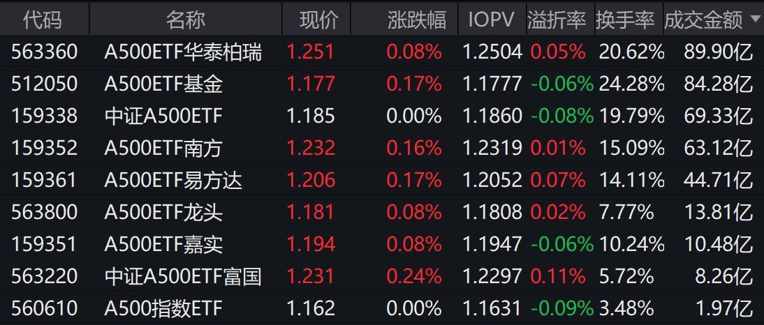 市场整体表现 - 市场早盘窄幅震荡,三大指数集体翻红,中证A500指数上涨0.07% [1] - 有券商观点认为,近期成交量有效放大,上证指数3900点平台筹码正在进行有序交换,前期观望资金有入场动作,A股市场人气处于逐渐复苏状态 [1] 板块与概念表现 - 商业航天概念持续走强 [1] - 半导体板块表现活跃 [1] - 贵金属概念高开低走 [1] 中证A500指数ETF交易情况 - 截至上午收盘,多只场内跟踪中证A500指数的ETF小幅上涨 [1] - 有9只中证A500相关ETF成交额超过1亿元,其中2只成交额超过84亿元 [1] - A500ETF华泰柏瑞早盘成交额为89.90亿元,现价1.251元,涨幅0.08%,IOPV为1.2504元,溢折率0.05%,换手率20.62% [1][2] - A500ETF基金早盘成交额为84.28亿元,现价1.177元,涨幅0.17%,IOPV为1.1777元,溢折率-0.06%,换手率24.28% [1][2] - 中证A500ETF成交额为69.33亿元,现价1.185元,涨幅0.00%,IOPV为1.1860元,溢折率-0.08%,换手率19.79% [2] - A500ETF南方成交额为63.12亿元,现价1.232元,涨幅0.16%,IOPV为1.2319元,溢折率0.01%,换手率15.09% [2] - A500ETF易方达成交额为44.71亿元,现价1.206元,涨幅0.17%,IOPV为1.2052元,溢折率0.07%,换手率14.11% [2] - A500ETF龙头成交额为13.81亿元,现价1.181元,涨幅0.08%,IOPV为1.1808元,溢折率0.02%,换手率7.77% [2] - A500ETF嘉实成交额为10.48亿元,现价1.194元,涨幅0.08%,IOPV为1.1947元,溢折率-0.06%,换手率10.24% [2] - 中证A500ETF富国成交额为8.26亿元,现价1.231元,涨幅0.24%,IOPV为1.2297元,溢折率0.11%,换手率5.72% [2] - A500指数ETF成交额为1.97亿元,现价1.162元,涨幅0.00%,IOPV为1.1631元,溢折率-0.09%,换手率3.48% [2]